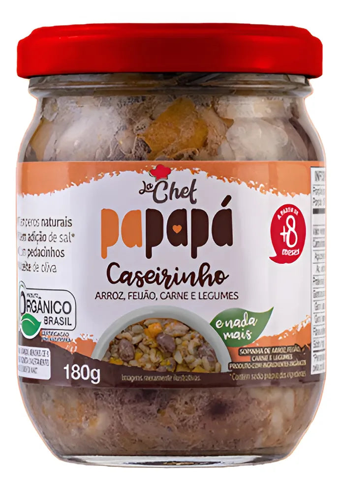 A Comidinha Arroz, Feijão, Carne e Legumes Orgânica (Caseirinho) Papapá conta com: arroz, feijão, legumes e temperos naturais. Não precisa de refrigeração, não possui sal adicionado e nenhum tipo de conservante, corante ou aromatizante.