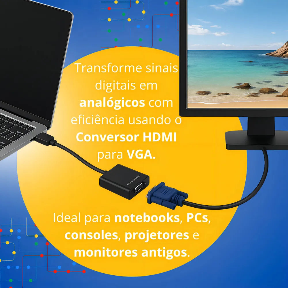 Com uma resolução máxima de 1080p, o conversor garante uma qualidade de imagem nítida e clara, ideal para reuniões, aulas ou entretenimento em casa. Seu acabamento na cor preta combina com qualquer ambiente, tornando-o um acessório discreto e funcional.
