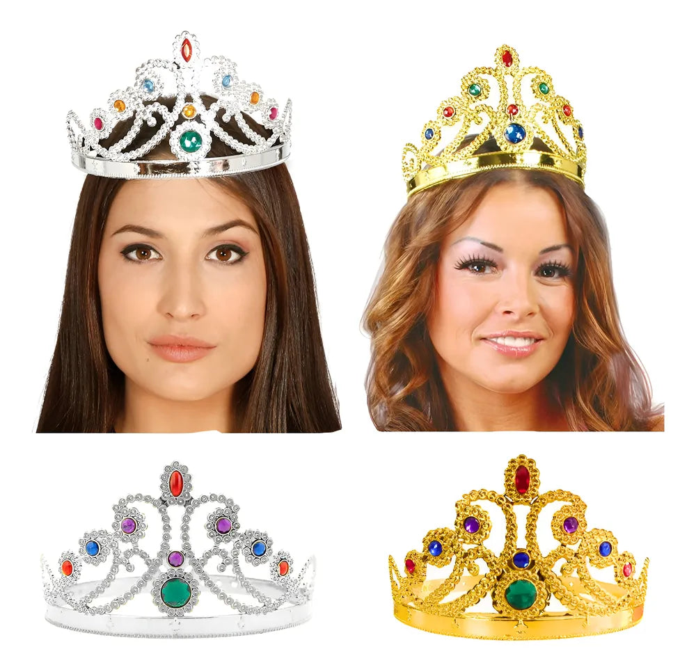 Essa Coroa da Rainha tem sua armação feita de plástico brilhante, tem um acabamento característico com pequenos adornos em pedras de plástico coloridas. Tem diâmetro de 18cm com opções para regulagem de tamanho, possui altura de 7,5cm.