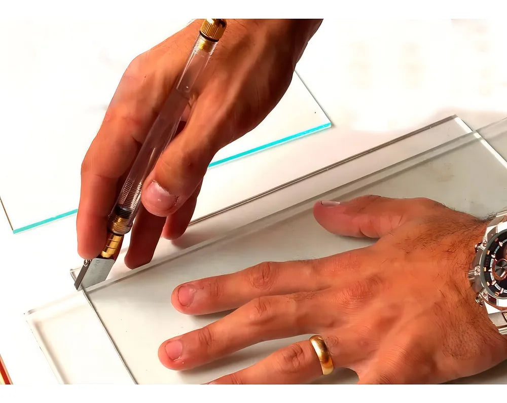 Colocar uma régua sobre o vidro a ser cortado e pressionar o cortador em movimento contínuo em sua direção.