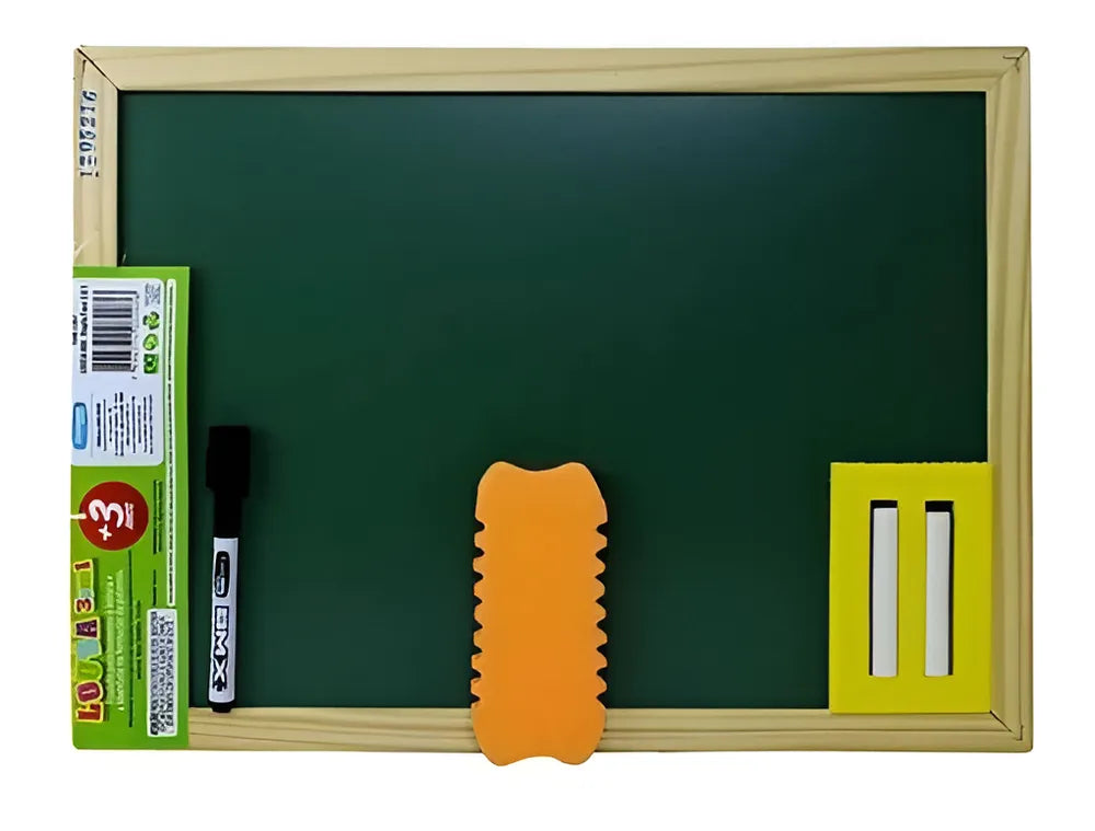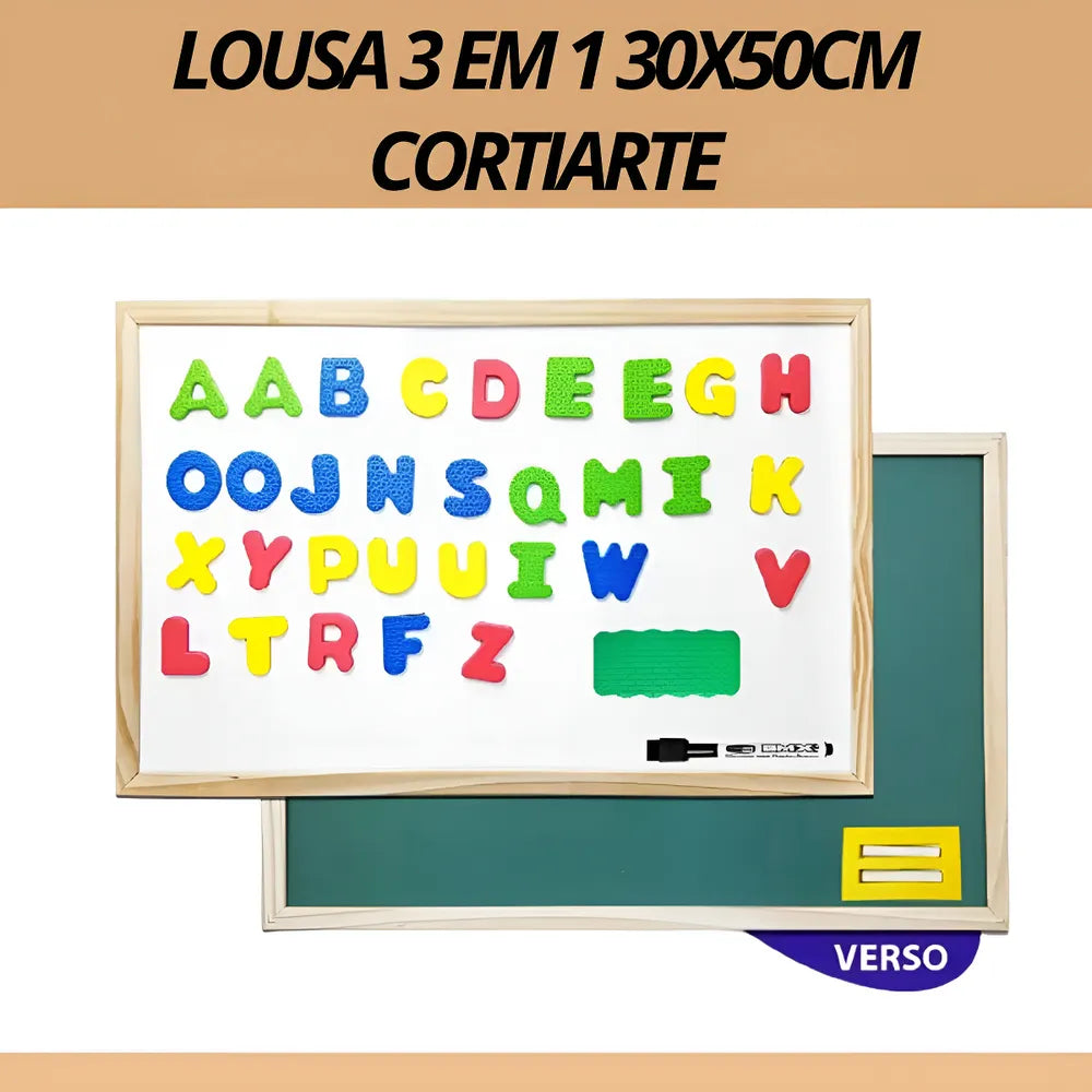 Quadro 3 em 1 Cortiarte. Com dimensões de 40 centímetros de comprimento e 30 centímetros de altura, este quadro multifuncional é magnético, pode ser utilizado como quadro negro e como lousa. Acompanha 2 gizes, letras do alfabeto em EVA, um apagador e uma caneta para lousa. Imagem meramente ilustrativa.