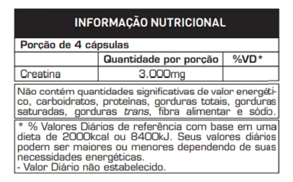 Creatina monohidratada, antiumectantes estearato de magnésio e dióxido de silício e cápsula (gelatina e corantes dióxido de titânio, amarelo de quinoleína e amarelo crepúsculo).