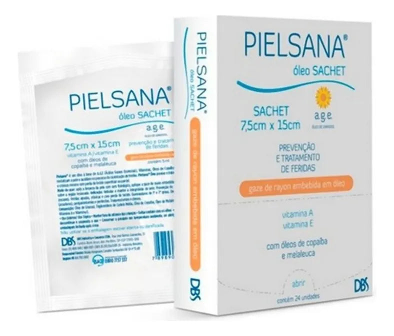 Pielsana Gaze de Rayon embebida em Óleo Dermoprotetor é um produto a base de AGE (Ácidos Graxos Essenciais), Vitaminas A e E, Óleos de Copaíba e Melaleuca que revitalizam a pele e auxiliam no processo de cicatrização de feridas. Previne e trata feridas agudas e crônicas mesmo com perda de tecido superficial.