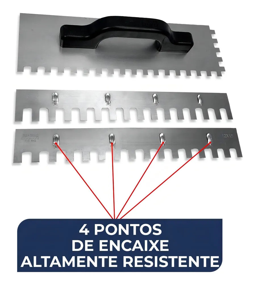 O modelo Kit Desempenadeira Dentada 3 em 1 possui 36cm de comprimento, proporcionando maior agilidade e precisão durante o assentamento. Com três opções de dentes, você pode escolher a largura ideal para cada tipo de piso ou revestimento, garantindo um acabamento perfeito.
