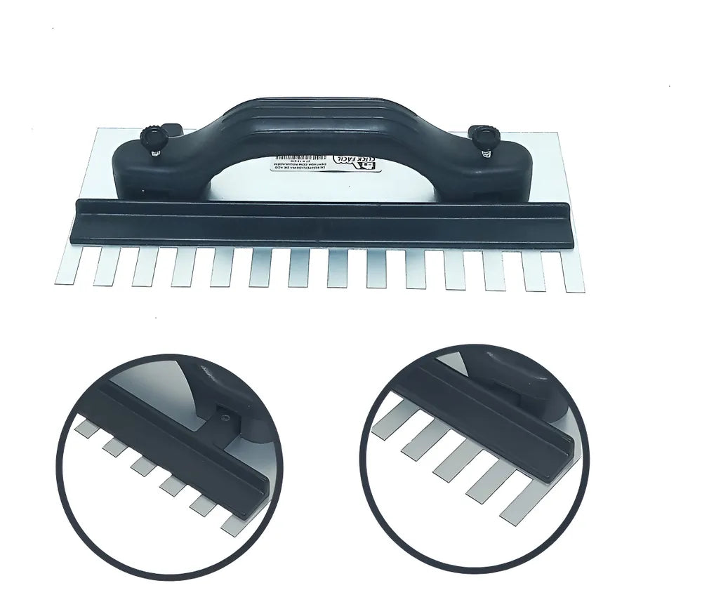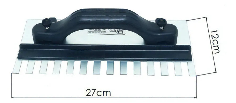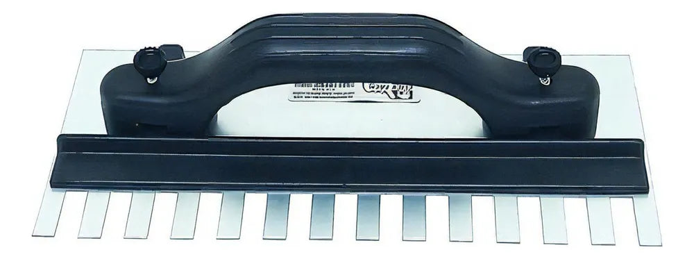 A Desempenadeira Aço Dentada Com Regulagem é a ferramenta ideal para profissionais que buscam precisão e qualidade no assentamento de pisos, porcelanatos e azulejos. Com uma lâmina robusta de aço mola anticorrosivo, garante durabilidade e resistência à corrosão, enquanto o plástico de engenharia do cabo oferece conforto e segurança durante o uso. A marca Tecnodesempenadeiras é reconhecida por sua excelência e inovação no mercado de ferramentas, e este modelo regulável permite ajustes finos para atender às necessidades específicas de cada trabalho. A espessura do aço de 0,60mm assegura a flexibilidade necessária sem comprometer a firmeza, e os dentes bem dimensionados promovem uma aplicação uniforme do material de assentamento. Esta desempenadeira é a escolha certa para um acabamento perfeito e profissional.