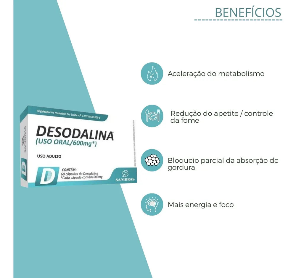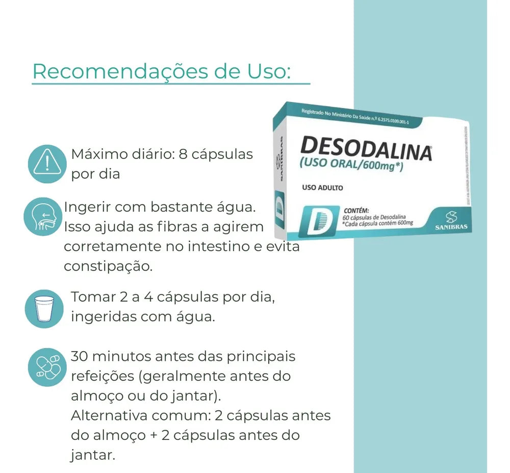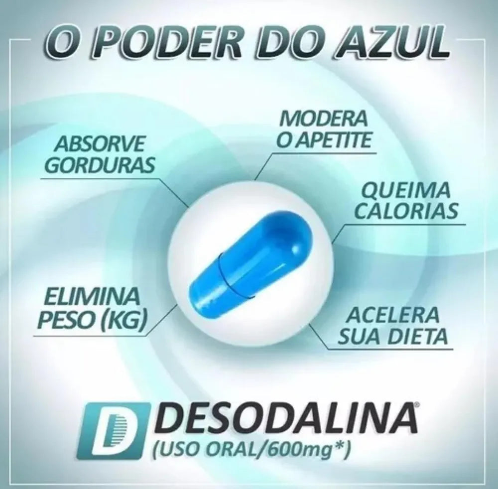 Desodalina 600mg - Desodalina é apresentado em uma caixa com 60 cápsulas azuis de 600mg cada. A dosagem varia de acordo com a indicação médica (mesmo sendo vendido sem receita, é aconselhável o uso com acompanhamento de um médico ou nutricionista, que recomendará a dosagem ideal), sendo normalmente 04 cápsulas ao dia, normalmente entre 30 minutos e 1 hora antes do seu almoço.