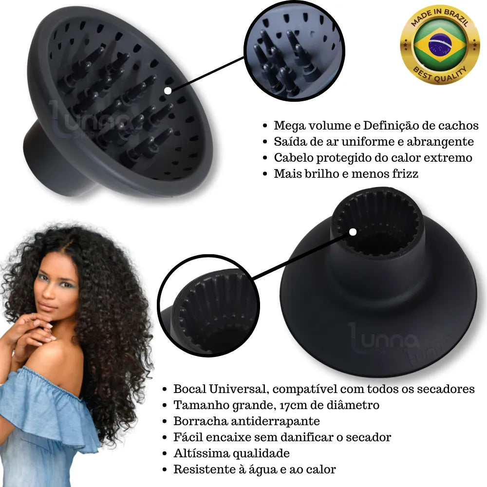O Difusor de cachos promove um mega volume e definição dos cachos, realça o brilho natural do cabelo, diminui o frizz e ainda melhora a textura do seu cabelo. Possui saídas de ar devidamente projetadas, para fornecer uma distribuição de ar uniforme e abrangente sem que danifique seu cabelo.