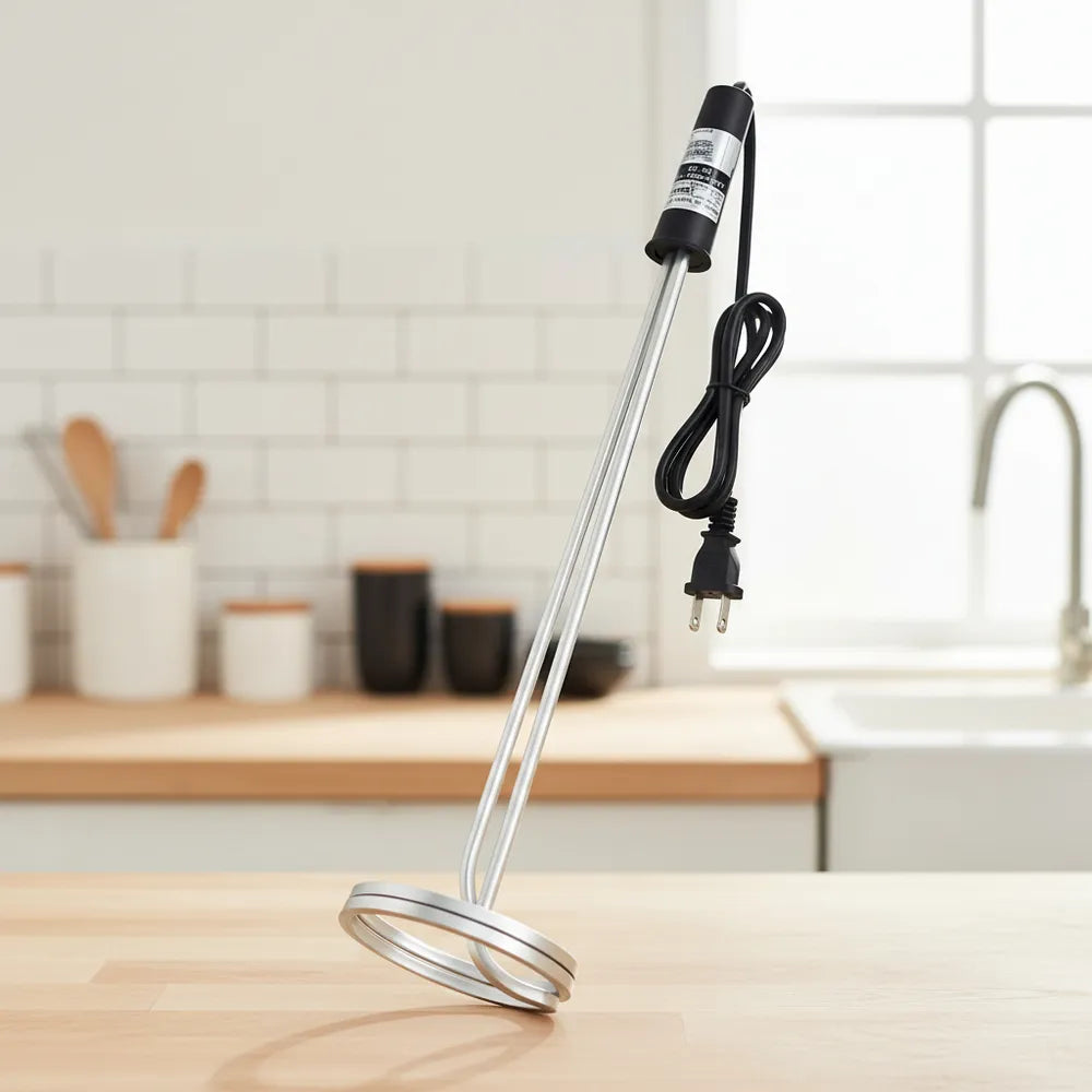 * Mantenha a parte metálica do ebulidor verticalmente na água. A altura do líquido deve estar acima da indicação exposta no mergulhão;