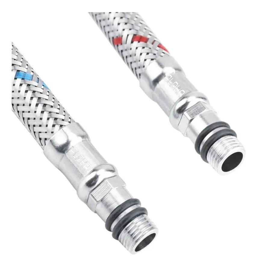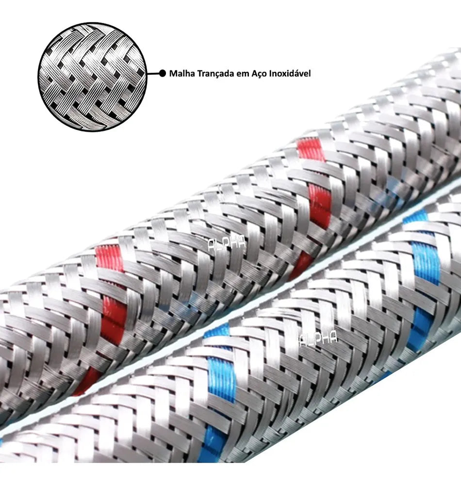 A Mangueira Flexível Para Misturador Monocomando Par de flexível (50 cm) é Produzida em Malha de Aço Inoxidável, rosca padrão para qualquer marca com padrão de 1/2 polegada e encaixe de 1/8. Produto utilizado para a ligação entre a rede hidráulica e a torneira, o engate flexível é um equipamento essencial em sua cozinha, banheiro ou lavanderia. Este modelo é fabricado em aço inox, um material de grande resistência e durabilidade, resistente a corrosões e não enferruja. Por ser flexível, adapta-se a qualquer tipo de instalação, sendo de fácil manuseio, prático, seguro e resistente às variações de temperatura, podendo ser utilizado para água fria e quente.