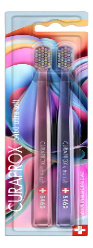A Escova Curaprox Ultra Soft 5460 Colorida vem em um conjunto de duas unidades com cores amarelo, rosa, roxo e vermelho. É fabricada com CUREN®, um tipo de fibra mais fina e macia que desorganiza totalmente a placa bacteriana sem causar injúrias ou traumatismos que podem levar a retrações gengivais.
