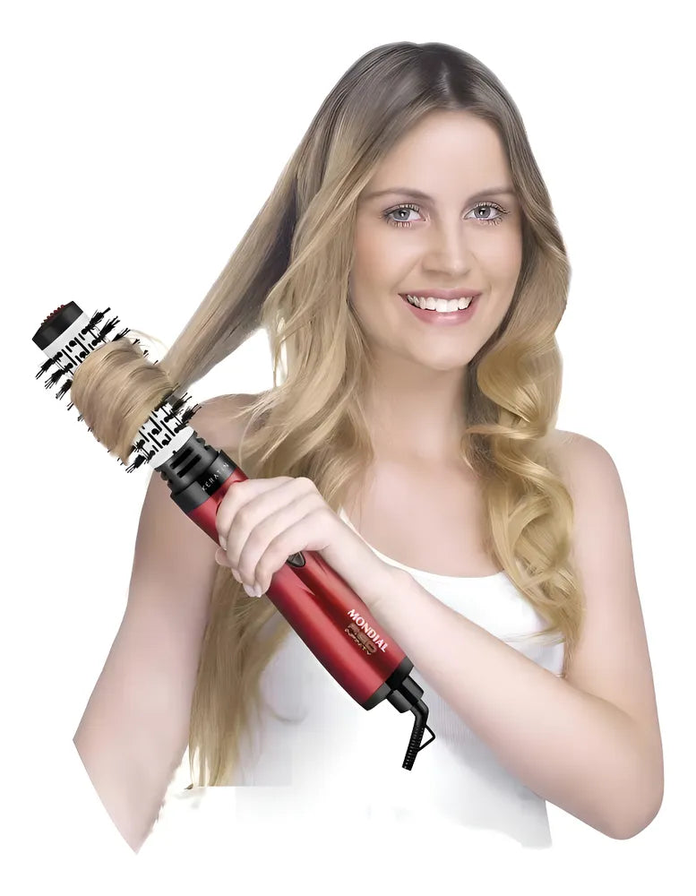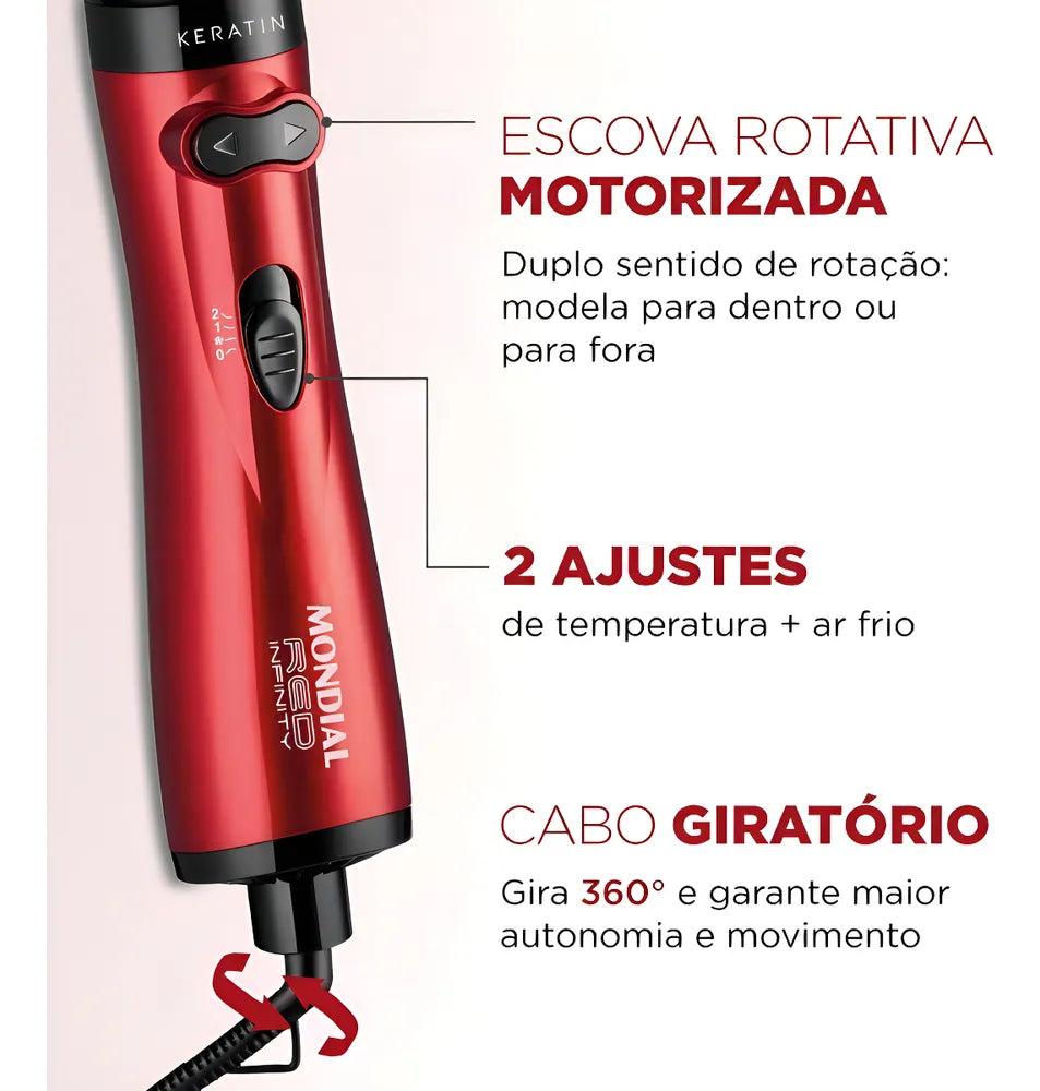 A escova Mondial une o movimento rotativo, parecido com a escovação, com o calor do secador. E tem duplo sentido de rotação: gira 360° nos dois sentidos, permitindo modelar o cabelo para dentro ou para fora.