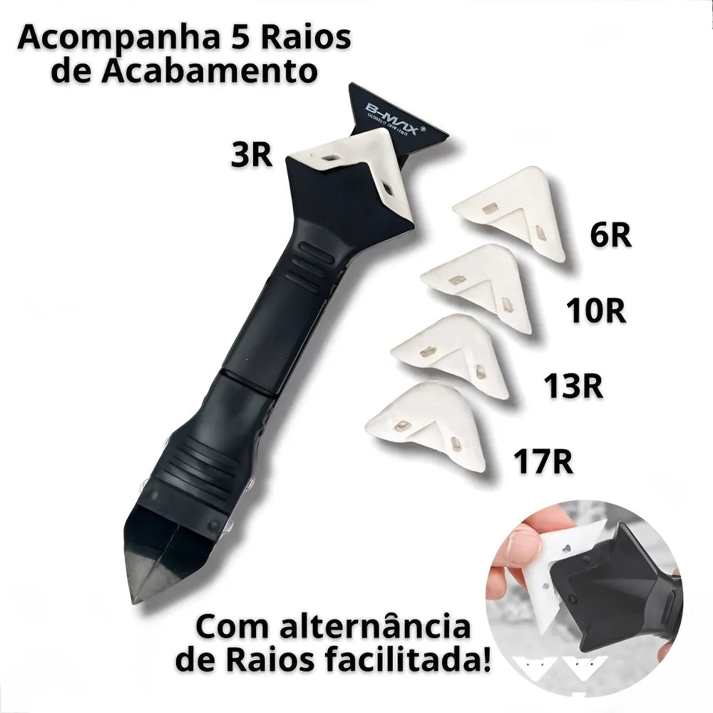 Acompanhada por cinco raios de acabamento (3R, 6R, 10R, 13R e 17R), essa espátula atende diversas necessidades, desde a remoção de silicone e rejunte até detalhes precisos de acabamento.