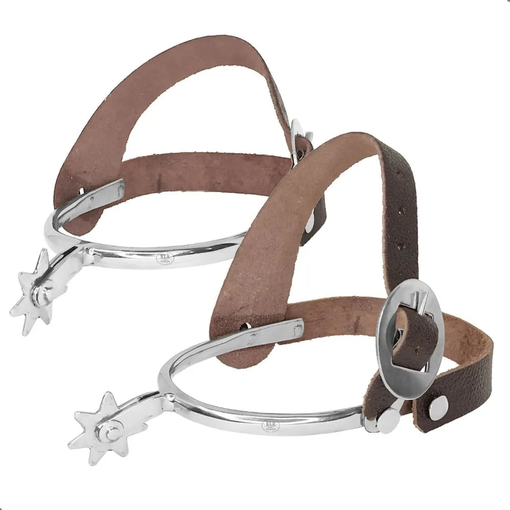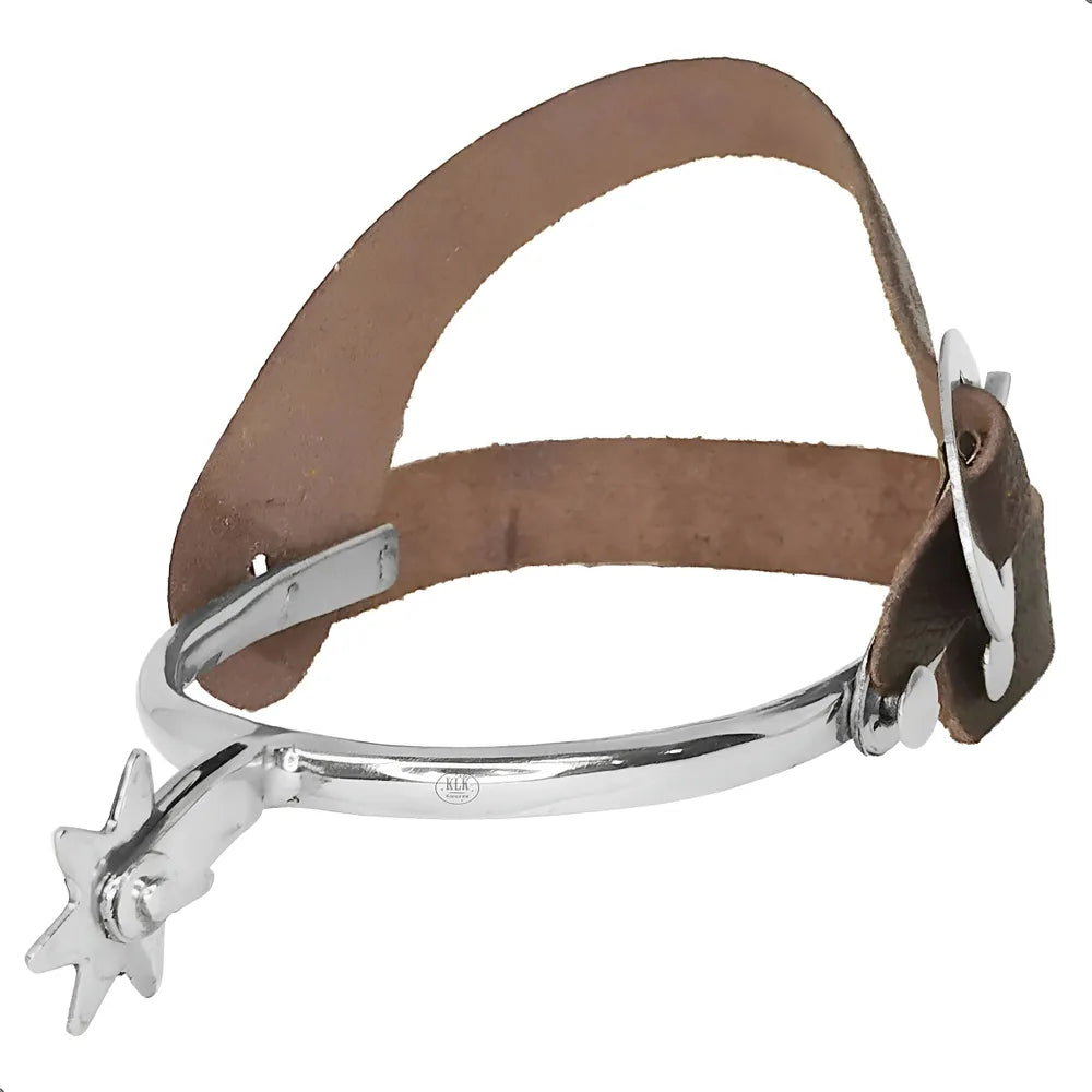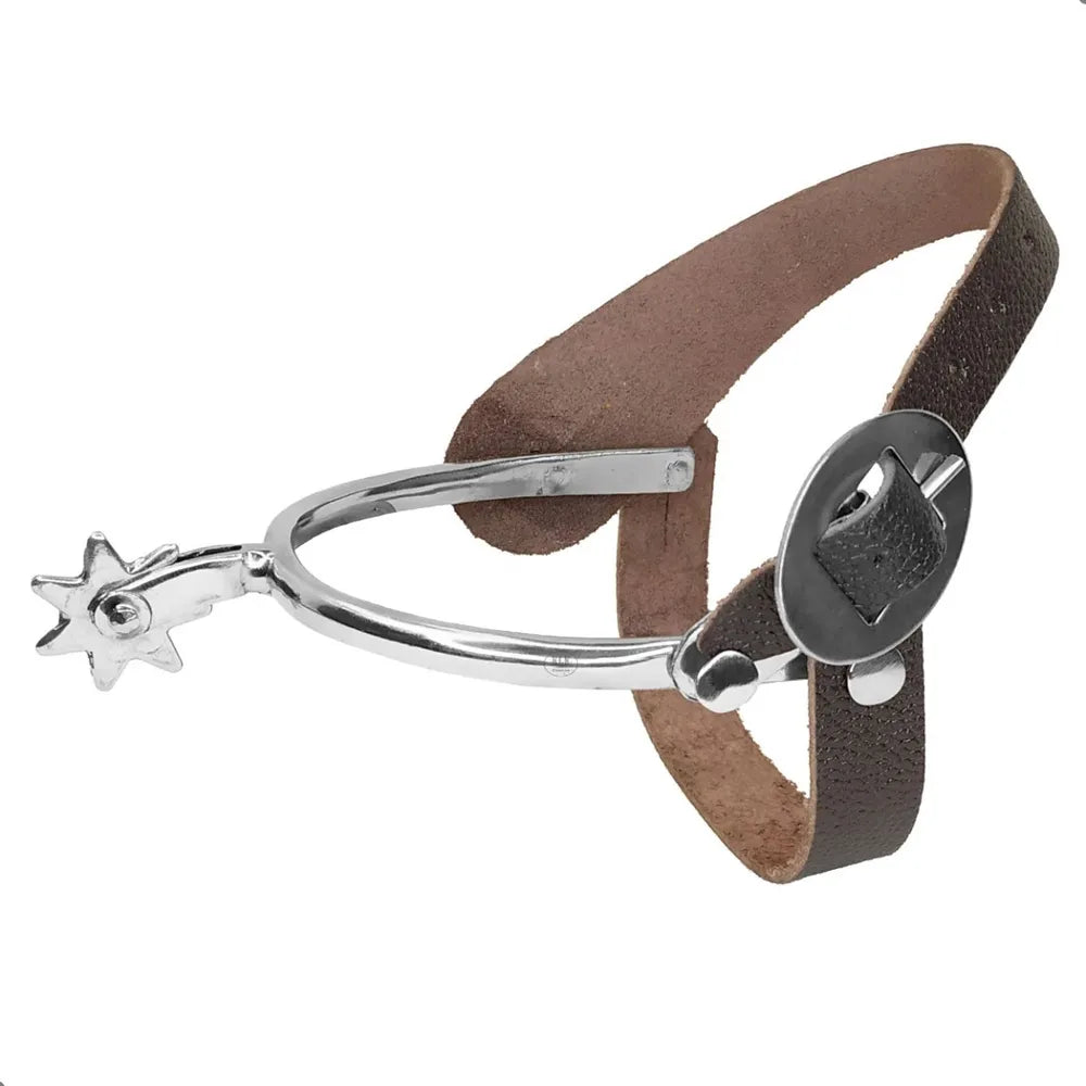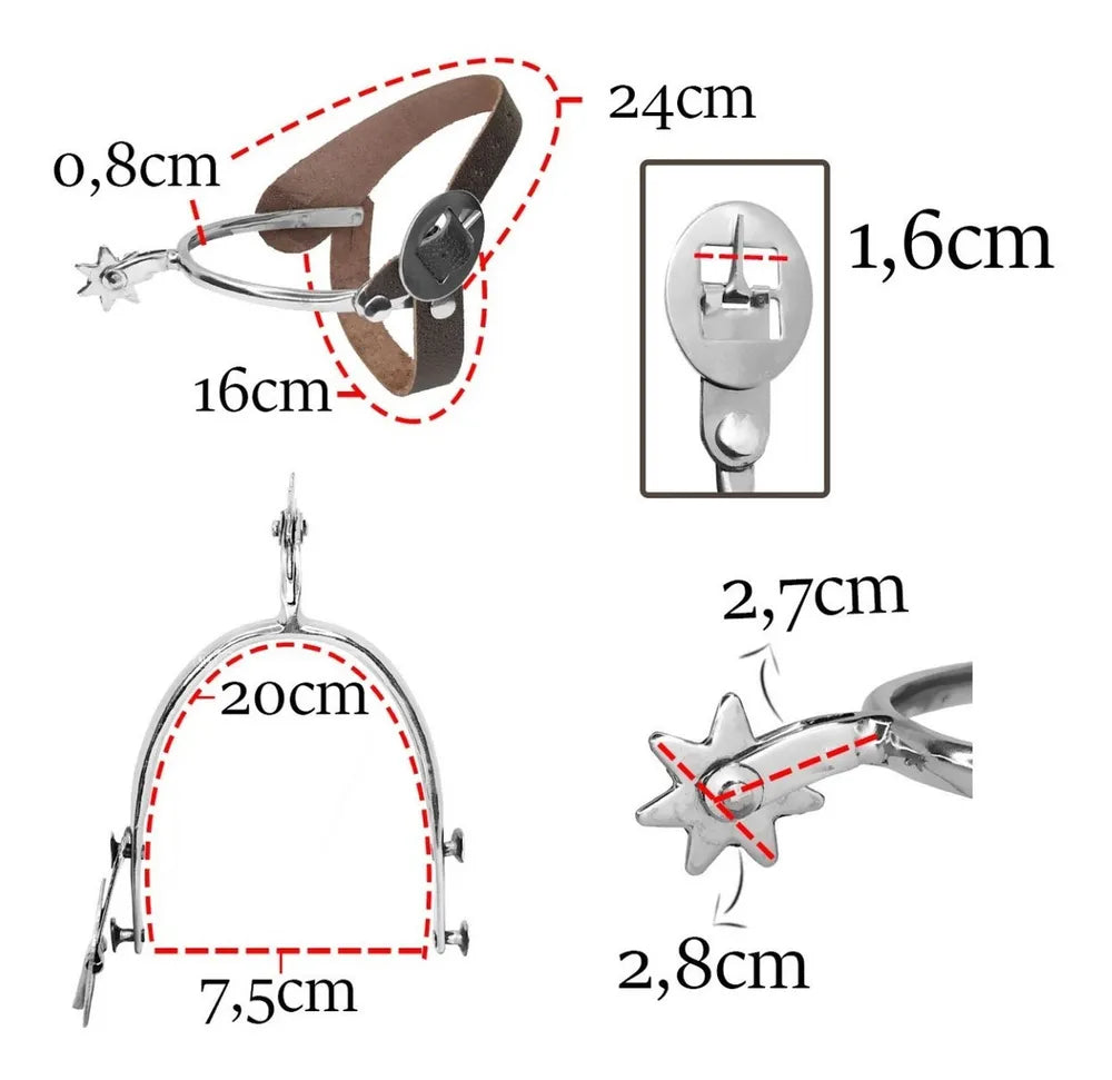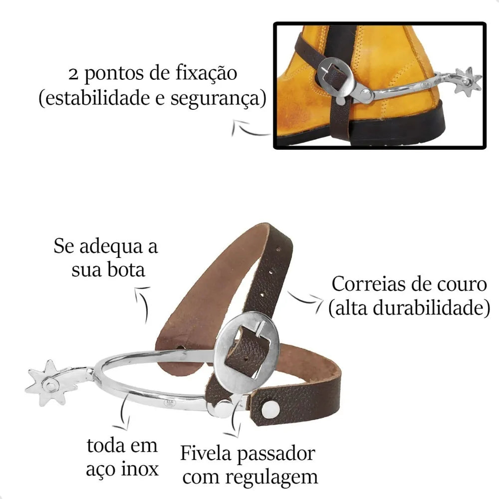 Produto versátil, leve, resistente, bonito e confortável. Confeccionada artesanalmente em aço inox. Rosetas que não possuem ponta e não ferem o animal. Correias em couro com dupla fixação. Ela se encaixa em qualquer bota e pode ser modelada facilmente com as mãos.