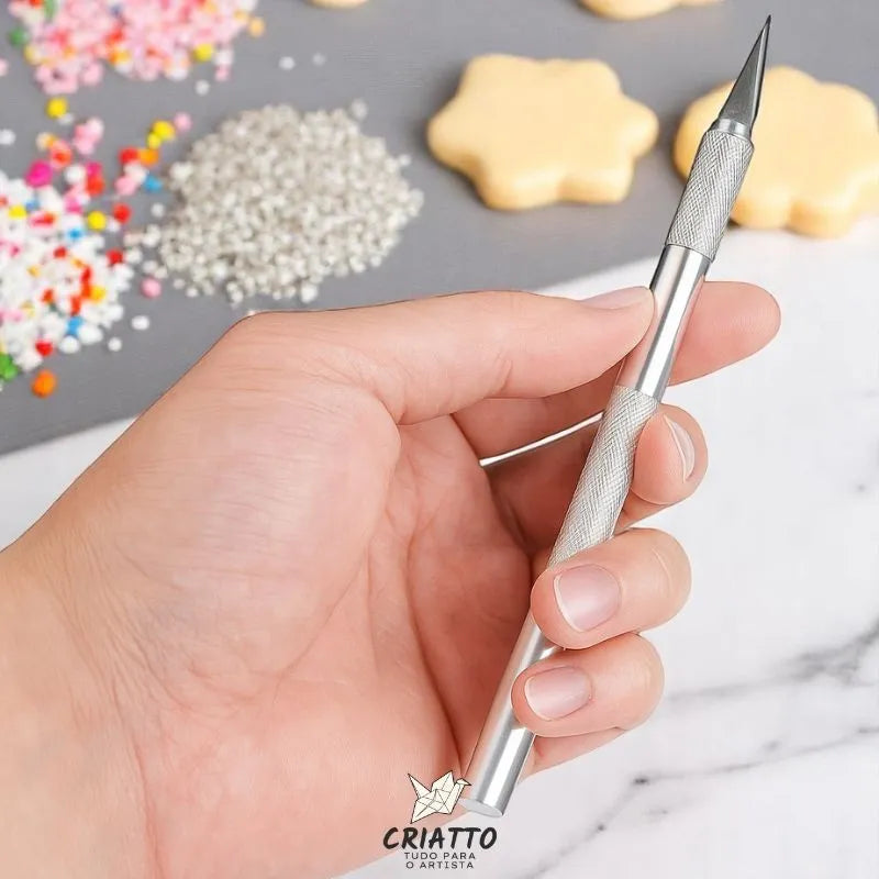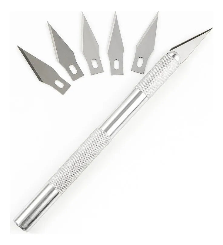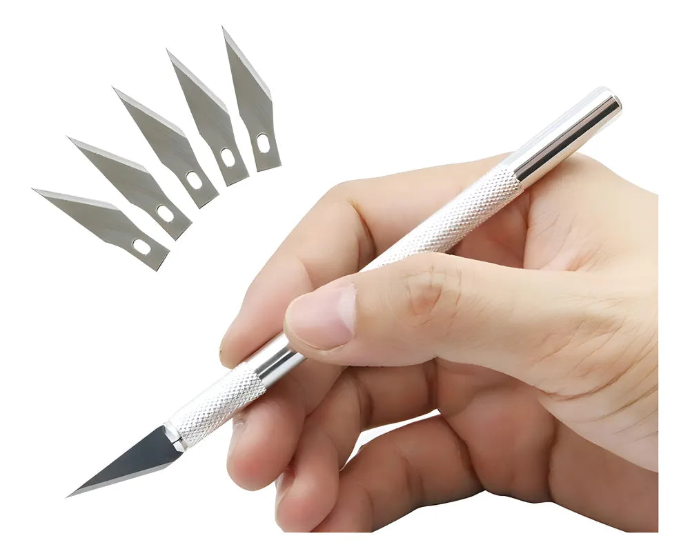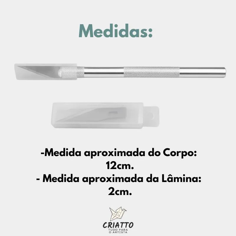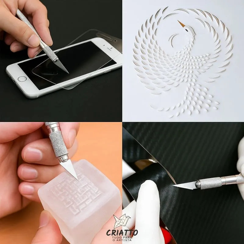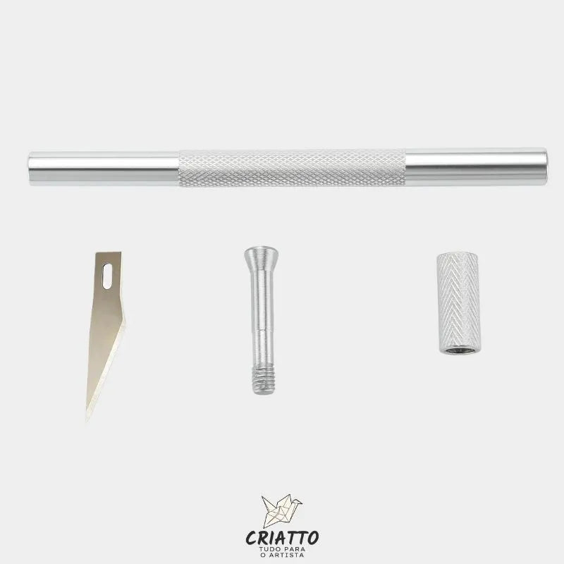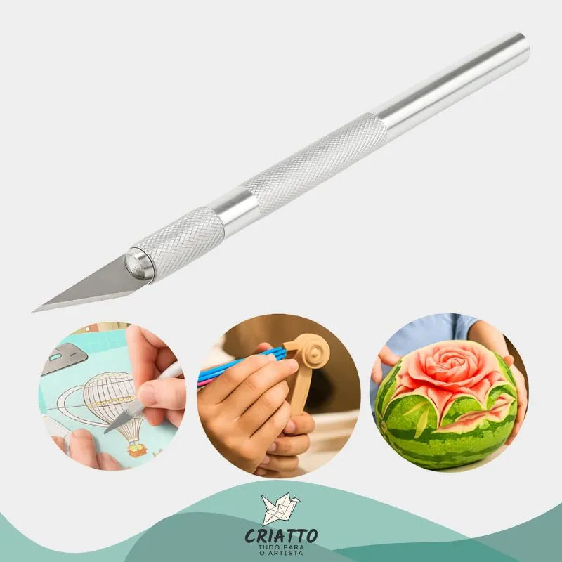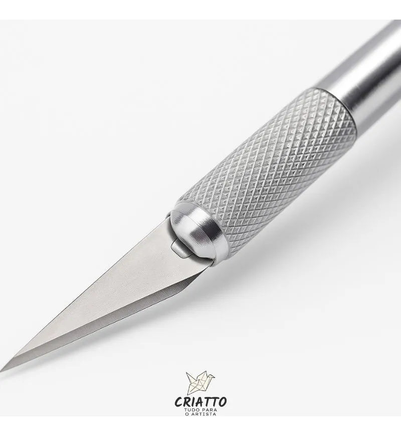 Fácil de Usar e Super Versátil:Este estilete tipo caneta é perfeito para quem busca precisão, segurança e conforto ao realizar cortes detalhados em diferentes materiais. Possui corpo de alumínio durável e cabo antiderrapante, garantindo firmeza nas mãos e controle total nos movimentos.Cortes Artísticos de Alta Precisão:Ideal para trabalhos manuais que exigem delicadeza e exatidão. Use para cortar papel, cartolina, plástico fino, vinil, fotos, tecidos leves e até alimentos em decorações culinárias! Combine com réguas e bases de corte para resultados impecáveis.Alta Durabilidade e Confiabilidade:Feito com materiais de qualidade, o cabo de alumínio sólido proporciona resistência e longa vida útil, mesmo com uso frequente. Confiável e resistente, esse estilete vai acompanhar você em muitos projetos criativos!Confortável e Compatível:Seu cabo ergonômico proporciona conforto mesmo em usos prolongados. Compatível com lâminas padrão como nº 10, nº 11, nº 16 e nº 17, oferecendo versatilidade para diferentes técnicas.Kit Completo Inclui: 1 Caneta Estilete com lâmina Tampa protetora de lâmina 5 Lâminas extras de reposiçãoPresente Criativo e EducativoAlém de funcional, é uma ótima opção de presente para quem gosta de desenhar, modelar, fazer scrapbook, origami, ou até mesmo culinária artística. Estimula imaginação, inventividade e habilidades práticas.