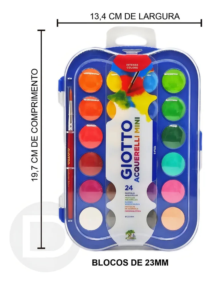 Apresentamos o Estojo De Aquarela Pastilha 24 Cores Giotto Mini + Pincel, uma criação da renomada marca Fila. Este conjunto de aquarela é perfeito para artistas de todas as idades e níveis de habilidade, oferecendo uma ampla gama de 24 cores vibrantes e ricas para dar vida às suas criações artísticas.