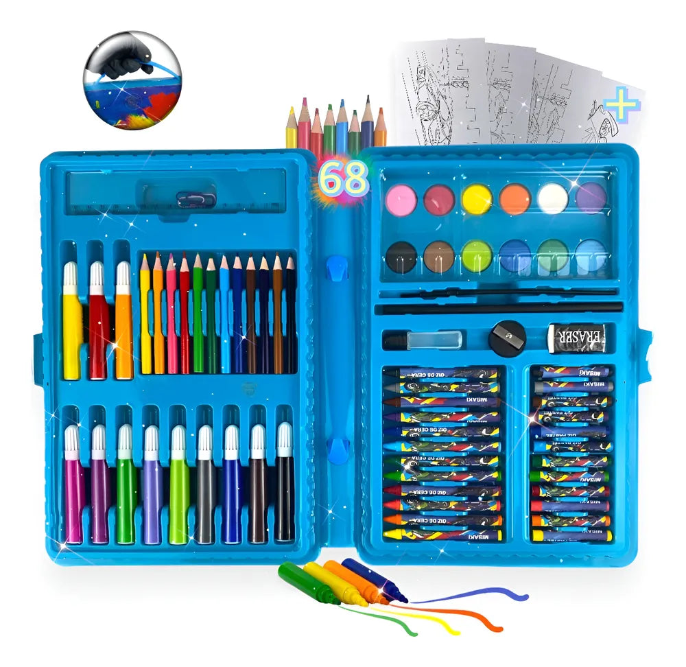 Estojo Maleta Escolar de Lápis, Caneta Hidrocor, Giz de Cera, Tintas e Outros Itens com 68 Peças