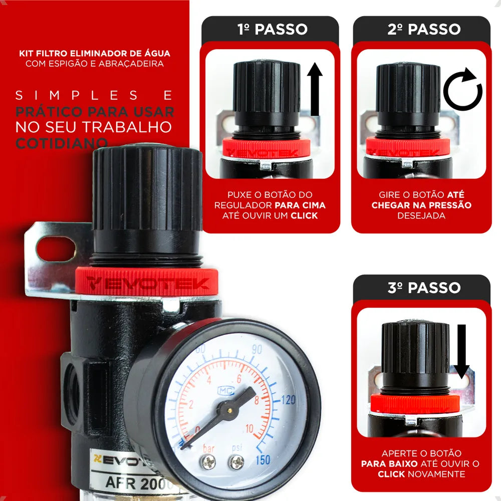 Tags: Filtro Regulador de Ar Compressor, Manômetro Medidor de Pressão com suporte, Pistolas, Pneumáticos, Borracharia, Compressores de ar, Linha Pneumática, Rede de ar, Baixa e Média Pressão.