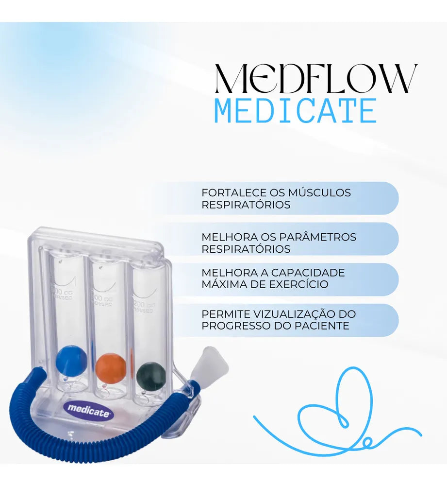 Para utilizar o MEDFLOW, você deve inspirar no bocal. Isso fará com que as esferas se movimentem e subam. As tubulações transparentes permitem a visualização do seu progresso. As tubulações são projetadas para proporcionar fluxos variados que incentivam o uso da força muscular respiratória treinando e fortalecendo o sistema respiratório. Além disso, possuem esferas coloridas de diferentes capacidades, possibilitando o acompanhamento do avanço do nível de dificuldade gradualmente.