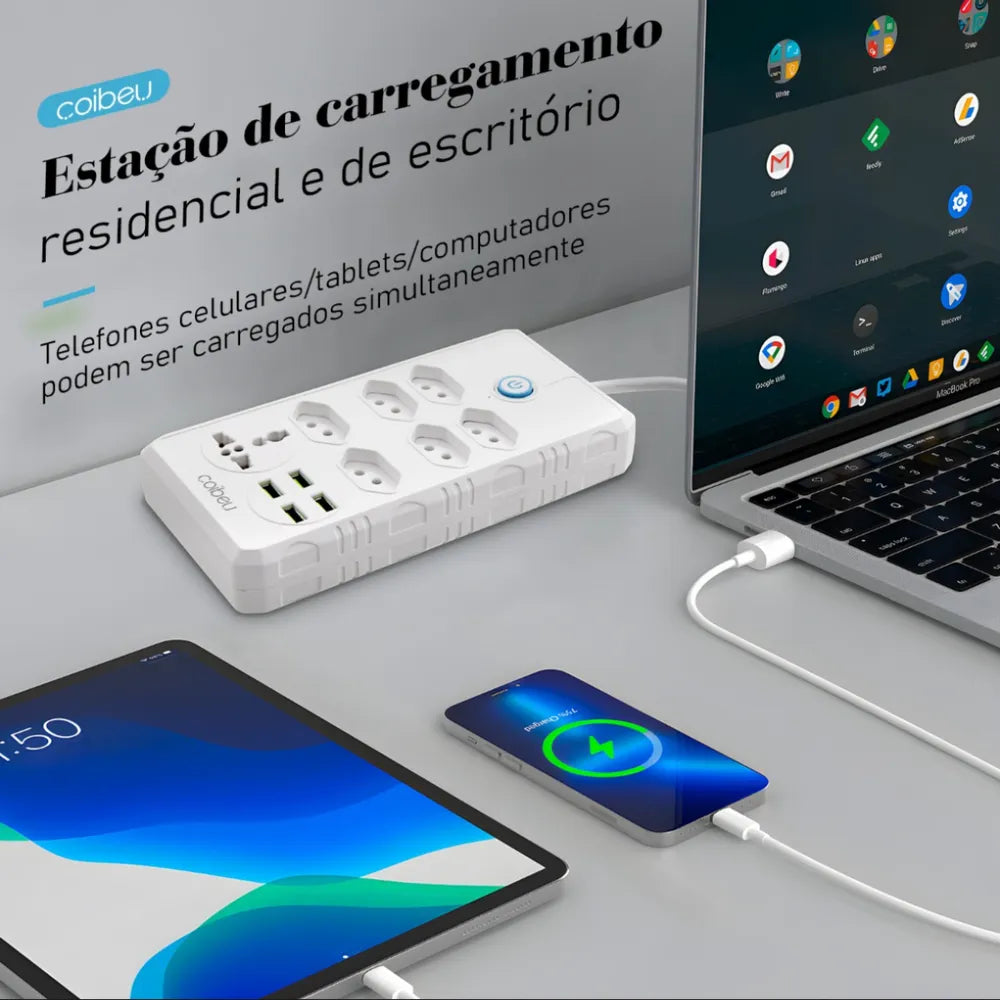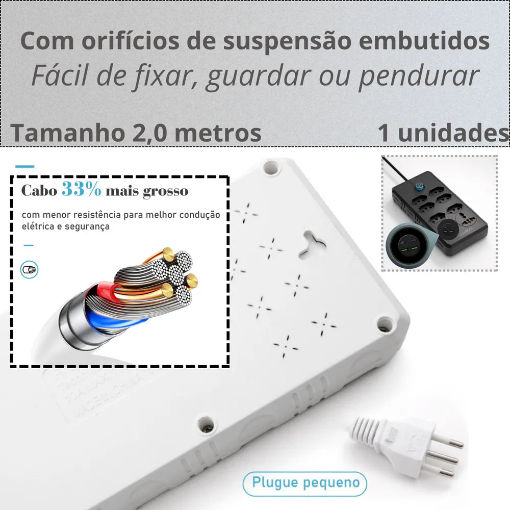 Eleve a sua experiência de carga a outro nível! A Extensão Tomada é essencial para quem procura eficiência e segurança. Equipada com 5 tomadas de energia, 4 portas USB e 2 tomadas padrao universal, esta régua permite que você carregue até 10 dispositivos ao mesmo tempo - de smartphones a computadores e tablets.