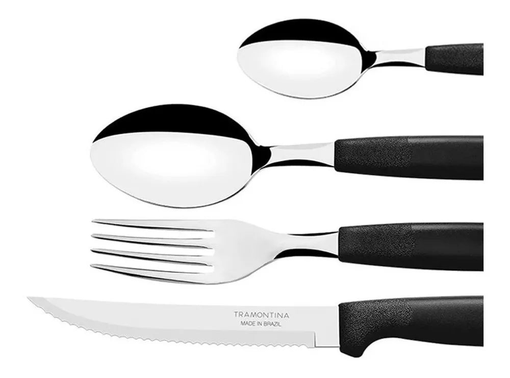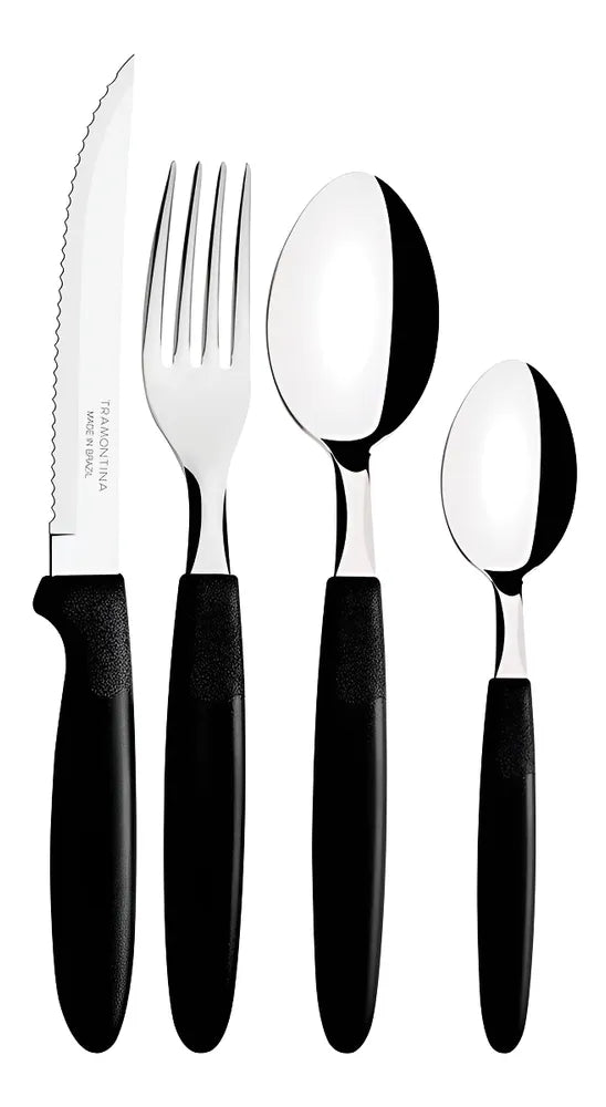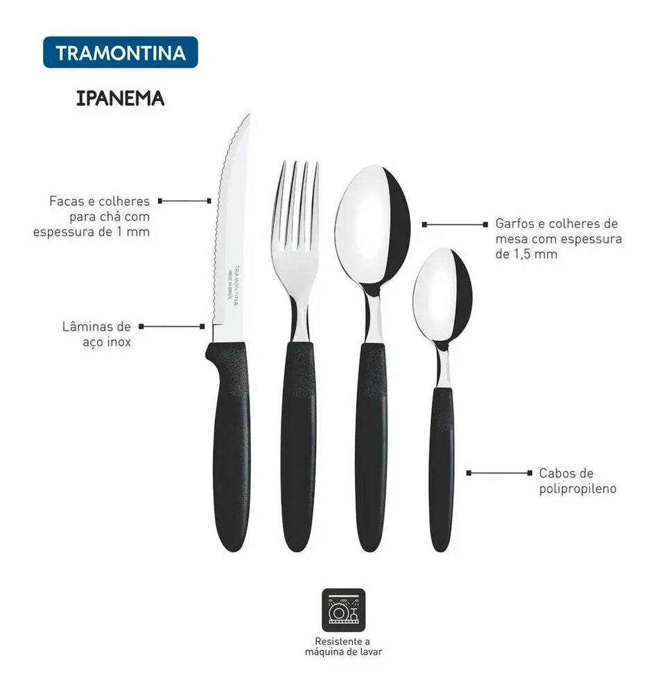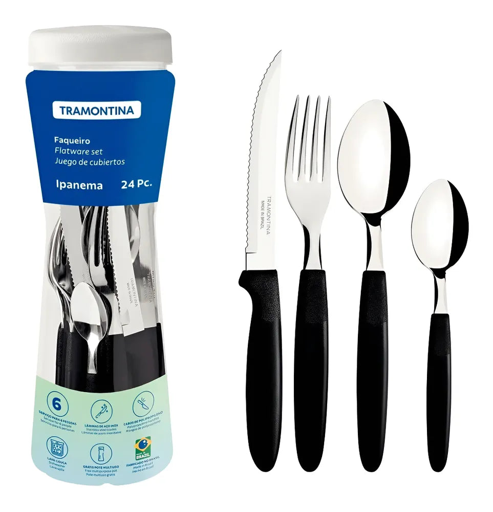 O Faqueiro Ipanema Preto Tramontina é um conjunto de talheres de 24 peças que inclui facas, garfos, colheres e colheres de chá. O conjunto possui lâminas de aço inoxidável e cabos de polipropileno com um elegante acabamento em preto.