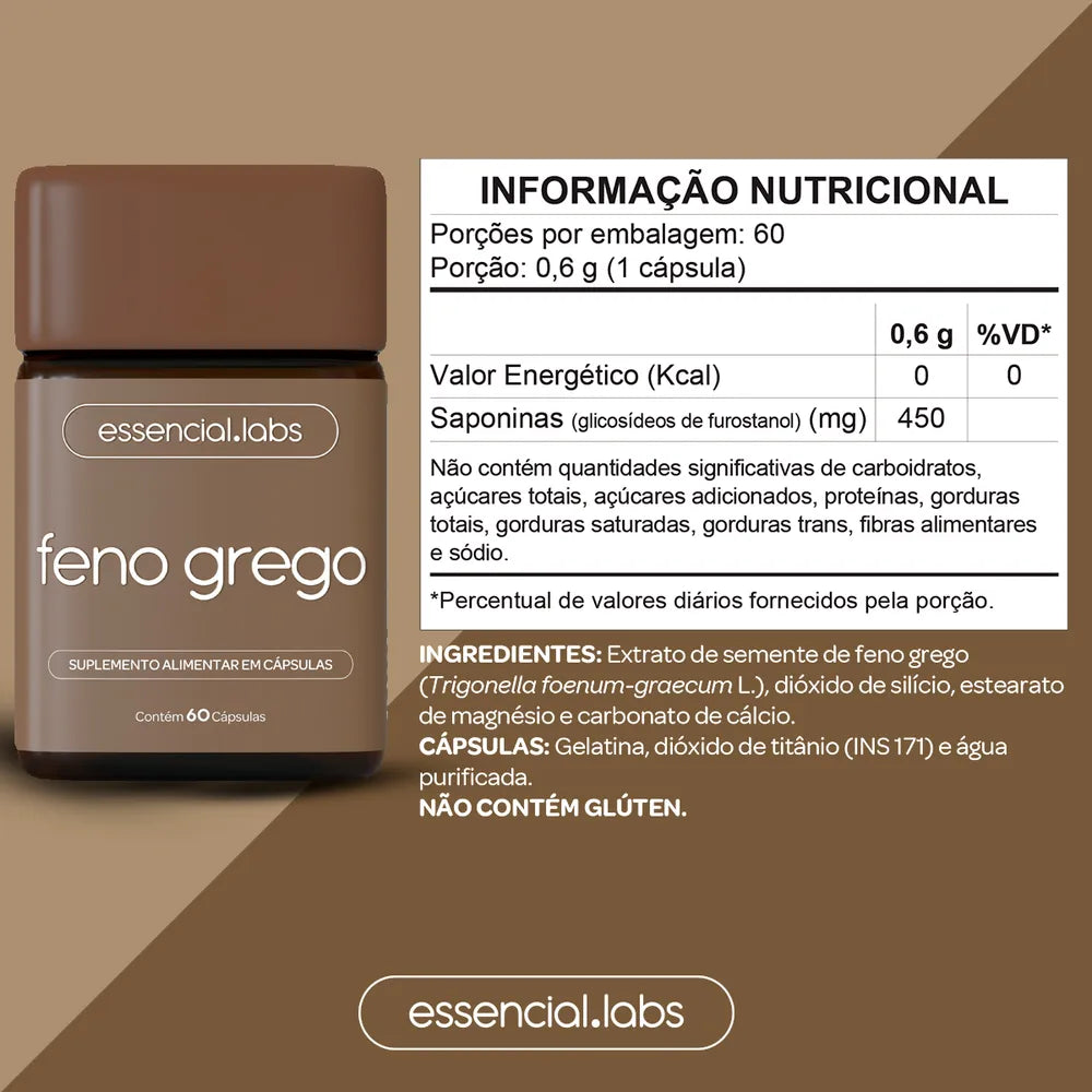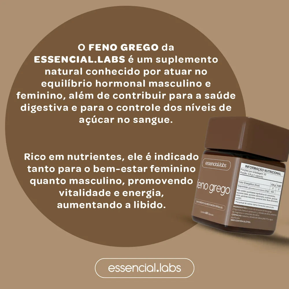 O FENO GREGO da ESSENCIAL.LABS é um suplemento natural conhecido por auxiliar no equilíbrio hormonal, contribuir para a saúde digestiva e auxiliar no controle da glicemia (nível de açúcar no sangue). Rico em nutrientes, ele é indicado tanto para o bem-estar feminino quanto masculino, promovendo vitalidade e energia. Produzido com matérias-primas de alta qualidade e controle rigoroso, o FENO GREGO da ESSENCIAL.LABS é uma opção confiável e eficaz para quem busca os benefícios dessa planta, com segurança e pureza garantidas.