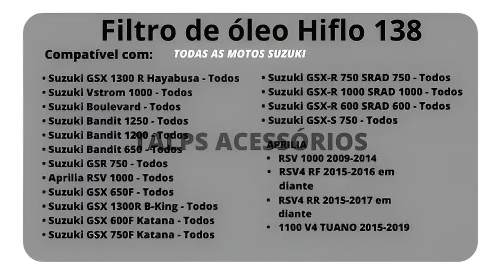 A minha suzuki gsx 1000 2007 usava o filtro tecfil psl 639 resolvi trocar por esse outro filtro por informações de mecânico questão de lubrificação mas no meu ponto de vista o tecfil tem mais furos de lubrificação de expansão mas não sou mecânico só visualizando as duas peças filtro instalado conforme a foto.