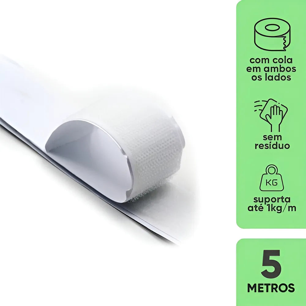 A Fita Com Adesivo Forte de 5 Metros da marca HOOK AND LOOP é a solução perfeita para organizar e fixar objetos sem a necessidade de furar paredes. Com sua cor branca e formato retangular, ela se integra facilmente a qualquer ambiente, proporcionando uma fixação segura e discreta.