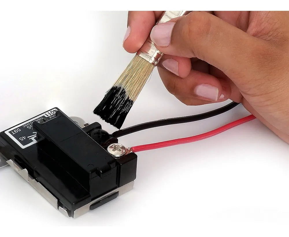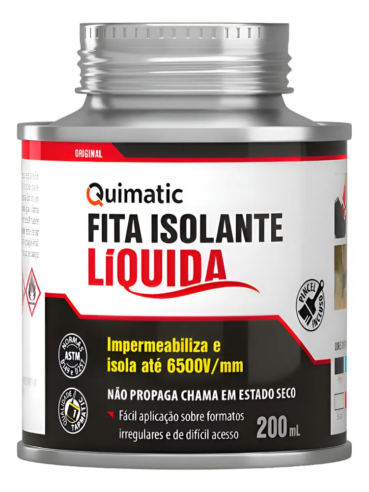 Fita Isolante Líquida Quimatic é uma composição de materiais isolantes elétricos, em solventes adequados, apresentado na forma líquida, para facilitar a aplicação e permitir a melhor cobertura e isolamento das conexões elétricas a serem protegidas. É o melhor método para isolar e impermeabilizar conexões elétricas, expostas às intempéries, enterradas, dentro de água ou em locais úmidos. Aplicado por imersão isola bobinas, cabos de ferramentas, circuitos impressos, etc. Numa espessura de 1 mm isola tensão de até 6500 volts.