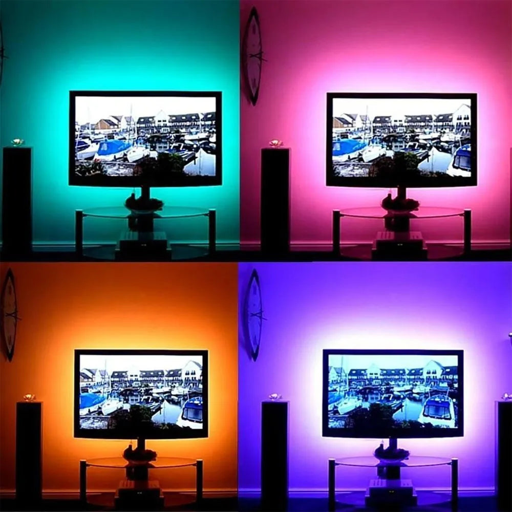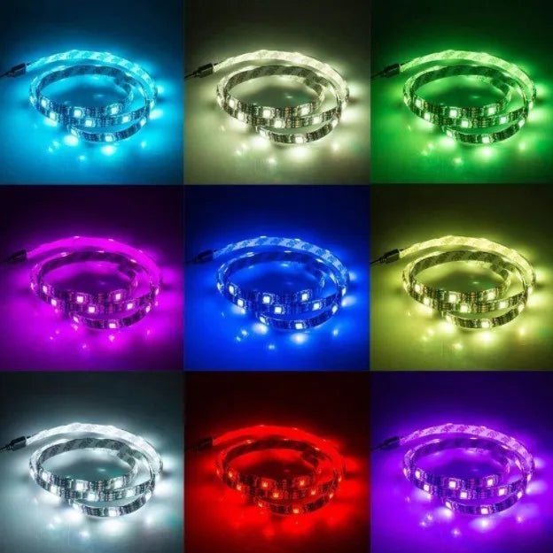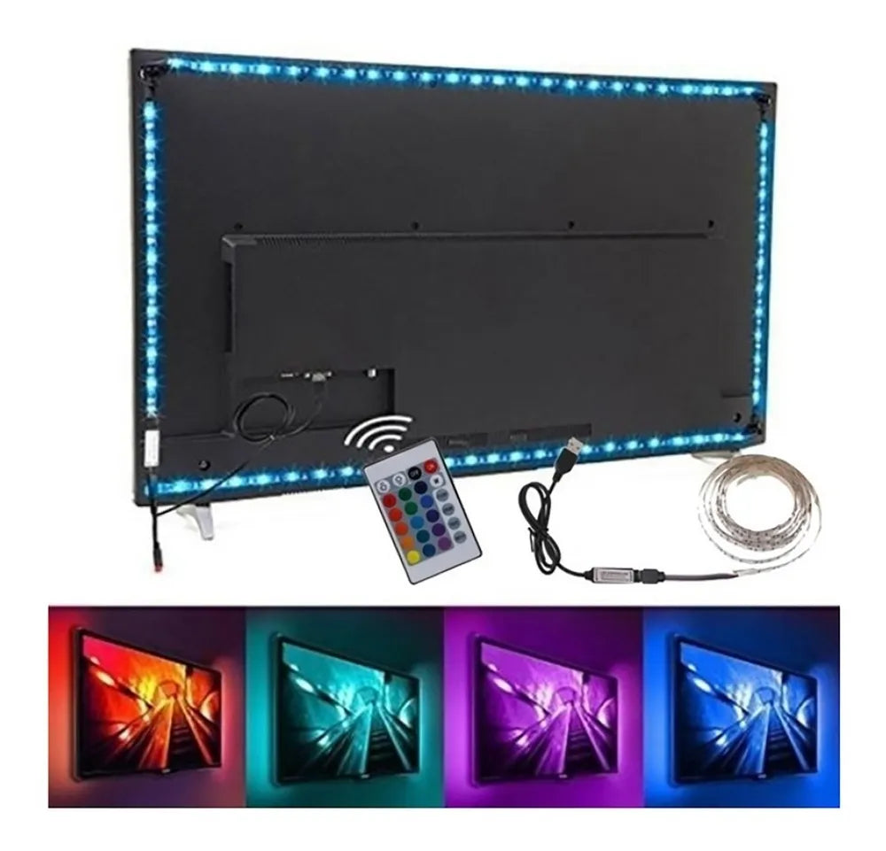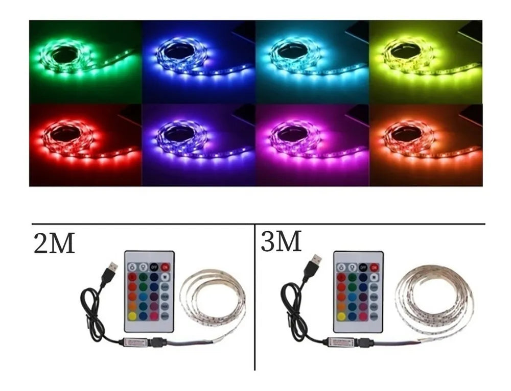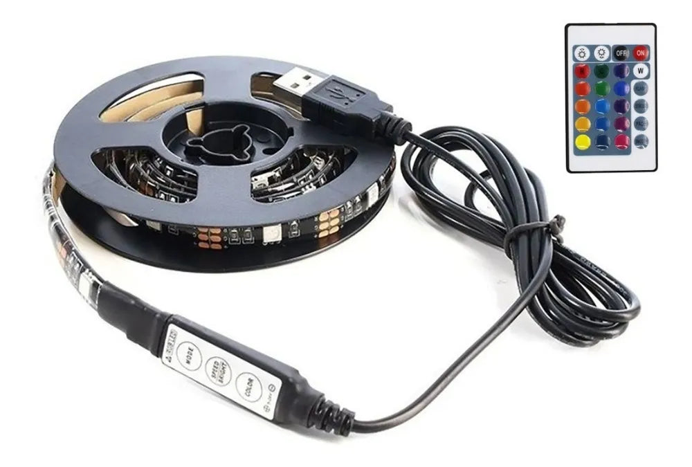 Fita LED 5050 RGB com controle remoto e 2 metros de comprimento, alimentação por USB 5V para uso em TVs, PCs e veículos.
