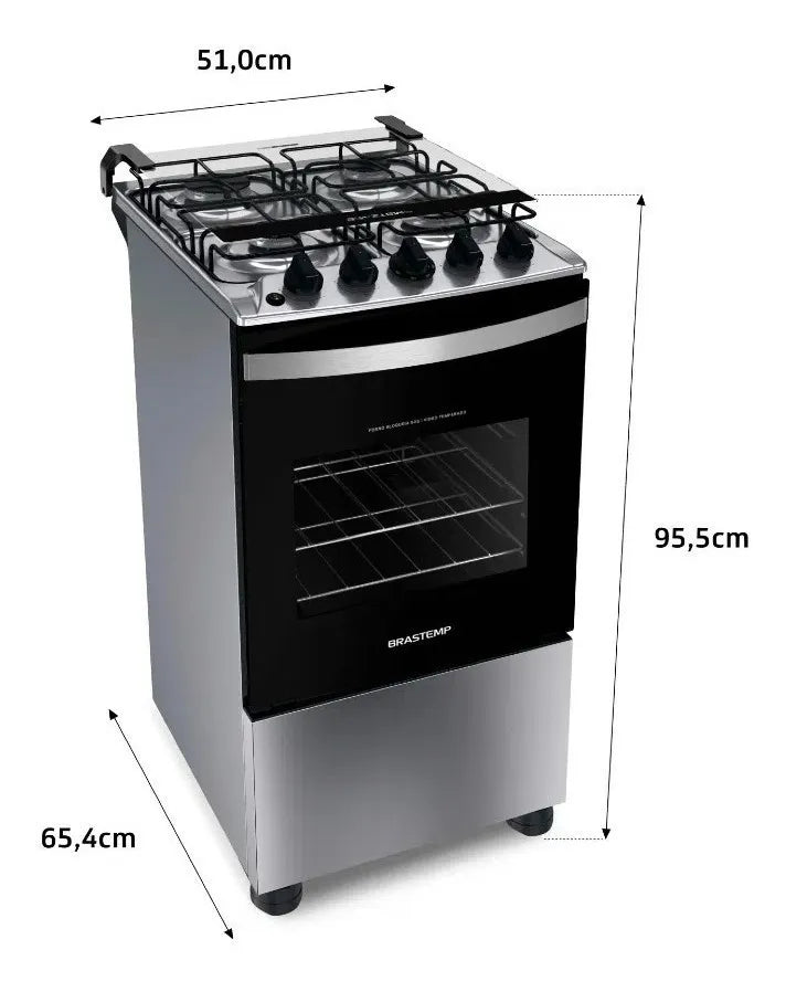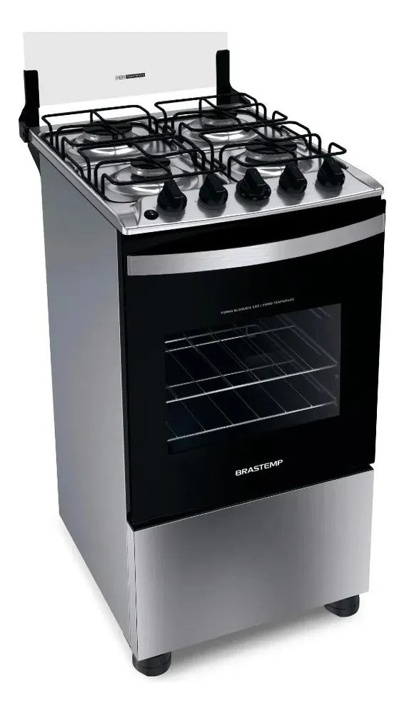 Fogão Brastemp de piso 4 bocas BFO4NBR com prateleiras ajustáveis que se adaptam aos tamanhos dos preparos e grades duplas. Acendimento automático e mesa em aço inox facilitam o uso diário.