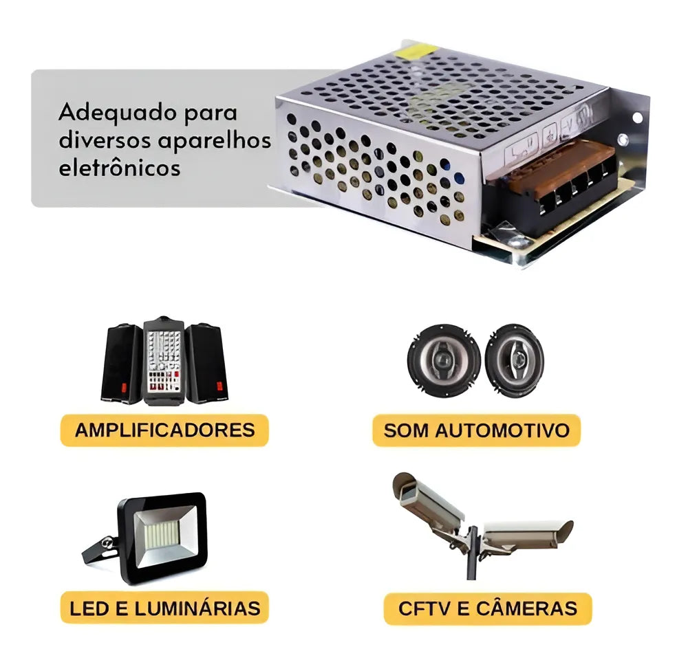 Desta forma, a fonte proporciona mais segurança ao ligar rádios comunicadores, suas fitas LED, câmeras de segurança, som automotivo e muito mais.