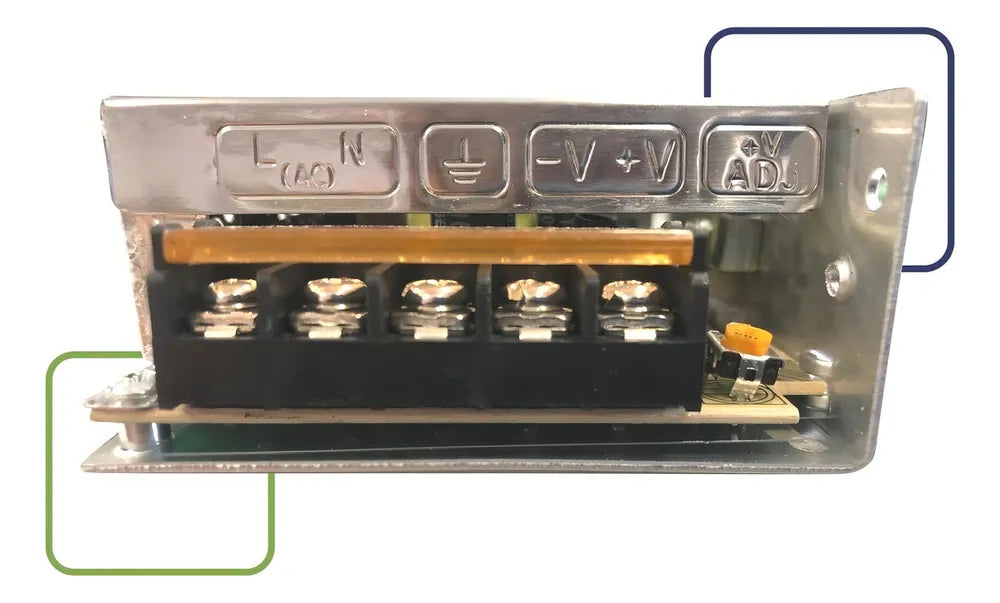 Conexão: 5 bornes (Fase, Neutro, Terra, Saída 12V Positivo e Negativo)