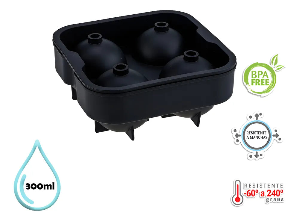 Forma de silicone premium para fazer 4 bolas/esferas de gelo redondo ideal para whisky, drinks, refrigerante, sucos ou a bebida de sua preferência.