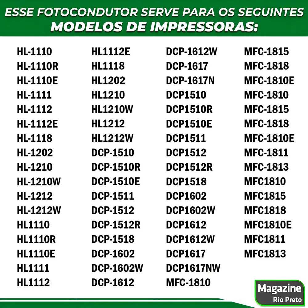 O Cilindro Fotocondutor é compatível com DR1060 TN1060 1060 DR1030 DR1035 DR1000. Apresenta-se na cor preta e tem um rendimento médio de 10.000 páginas com 5% de preenchimento no papel A4. O rendimento pode variar de acordo com as impressões realizadas, a média é baseada na norma ISO / IEC 19752 considerando imagens e gráficos.