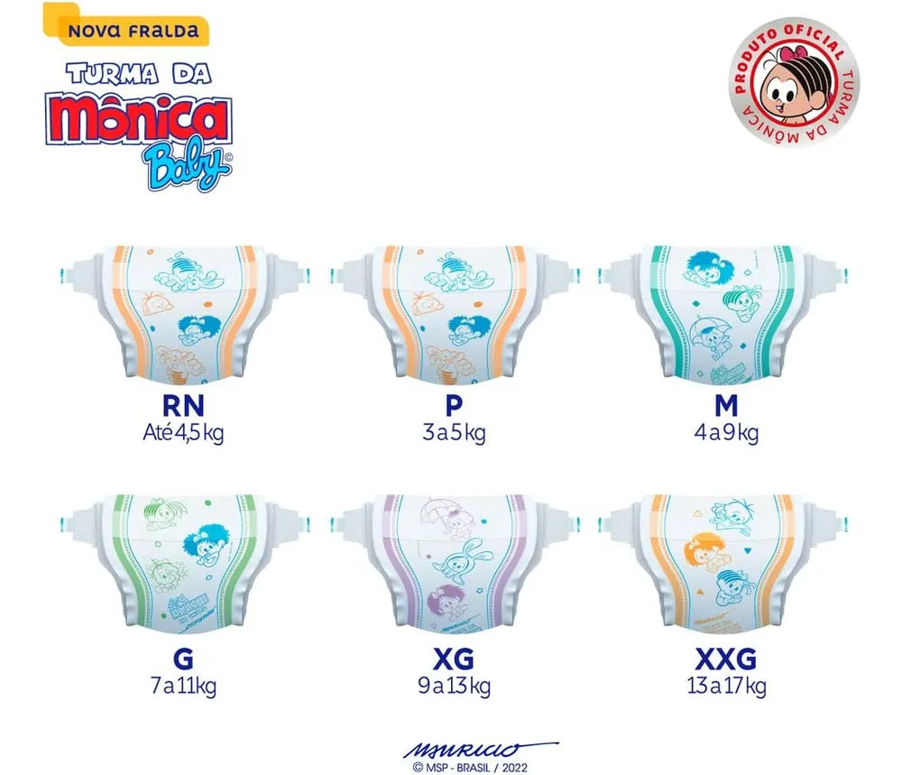 A Turma da Mônica Baby uniu proteção e conforto em uma fralda para que seu bebê cresça feliz e tenha as melhores lembranças da infância. A fralda Turma da Mônica Baby possui a Tecnologia QuatroSec, mantendo o bebê calmo, tranquilo e seguro durante o dia e a noite. Com um sistema de canais que distribui o xixi de forma mais rápida, barreiras que impedem vazamentos e uma camada extra que ajuda a manter o bebê seco por até 12 horas. A cintura elástica assegura um ajuste ideal ao corpo do bebê.