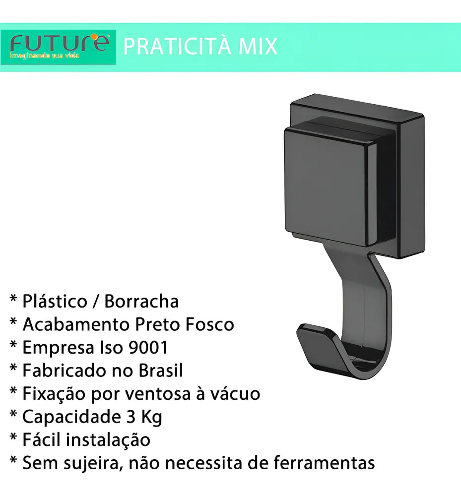 Gancho Multiuso Plástico Com Ventosa Forte Preto Future