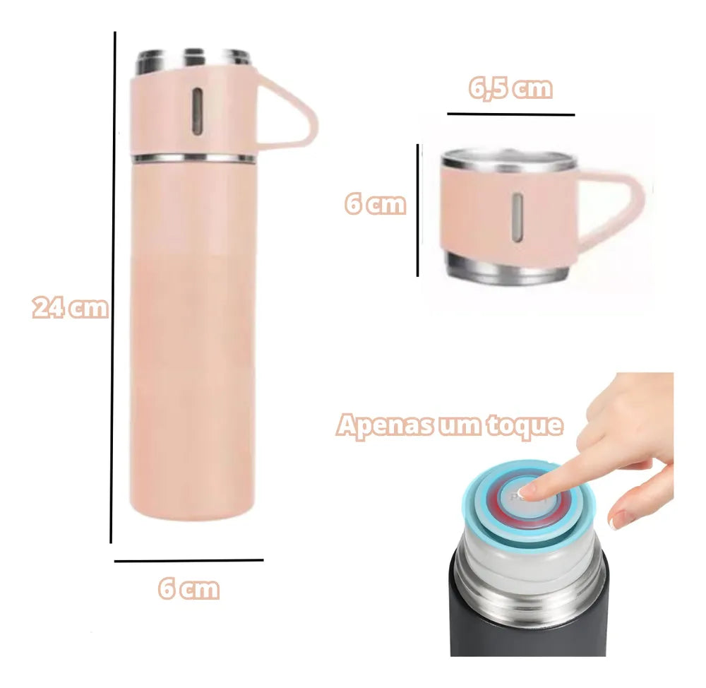 A Garrafa Térmica Vacuum Tche Amo Inox Com Xícaras Água Café Cor Rosa é perfeita para quem busca praticidade e estilo. Feita em inox, tanto por dentro quanto por fora, garante a conservação da temperatura da bebida por até 12 horas. Com capacidade de 500 mL, é ideal para levar seu café, chá ou água para onde quiser. O sistema de abertura da tampa é rápido e seguro, proporcionando facilidade no uso. Além disso, o conjunto inclui xícaras, tornando-o completo e pronto para uso imediato. Com design na cor rosa, é uma opção moderna e elegante para acompanhar seu dia a dia.