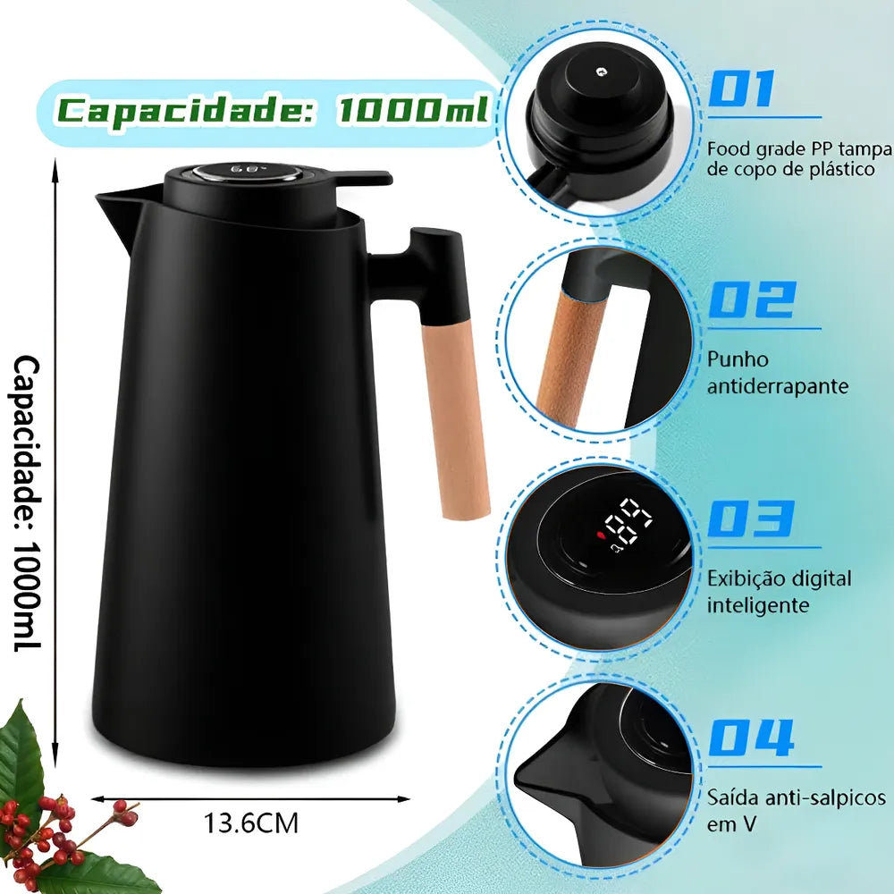 Para você que gosta de sempre manter suas bebidas em uma temperatura ideal temos a nova linha de garrafa térmica com termômetro digital, que permite a visualização da temperatura da sua bebida, possui uma ampola espelhada de vidro duplo, com isolamento a vácuo, garante maior tempo de conservação de temperatura, a garrafa tem capacidade de armazenar 1L de sua bebida predileta.