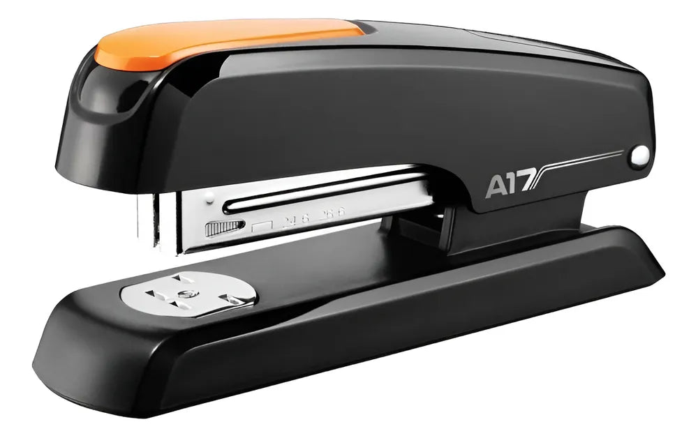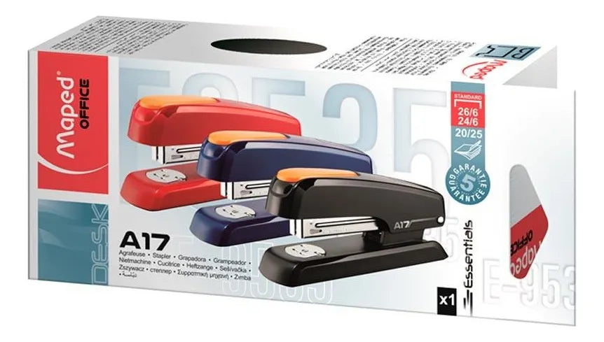 Este grampeador de mesa da Maped combina funcionalidade, qualidade e resistência. Possui estrutura em aço polido, acabamento em plástico e apoios emborrachados que proporcionam conforto durante o manuseio.