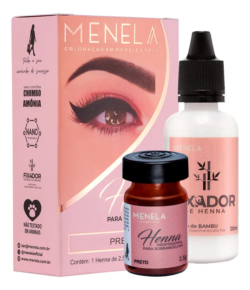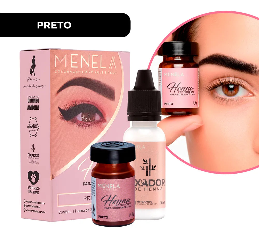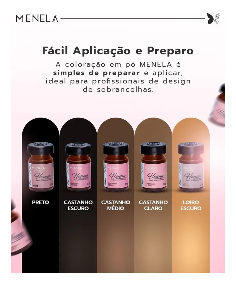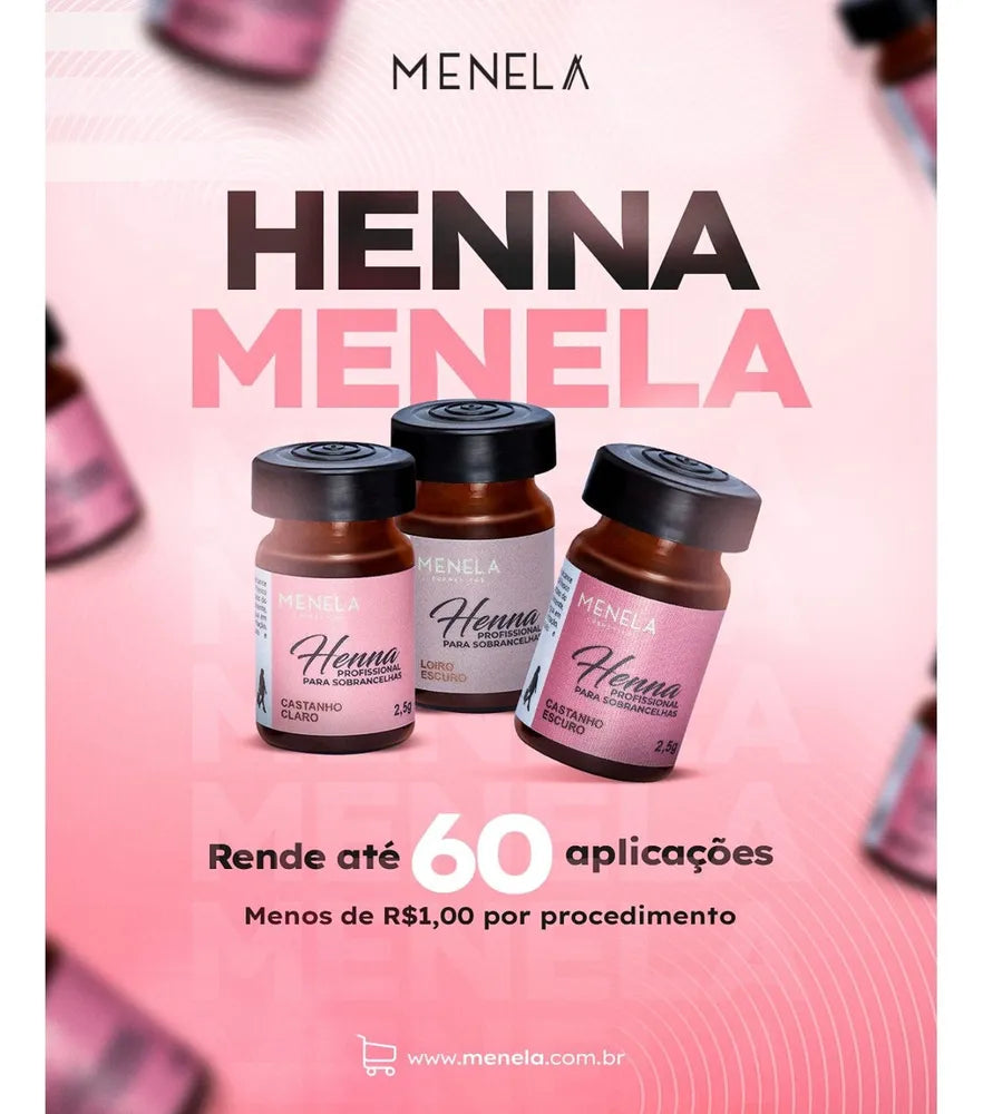 A Henna Menela é conhecida como a número um entre as profissionais designers de sobrancelhas, ela foi desenvolvida com nanotecnologia, garantindo alta performance para profissionais designers de sobrancelhas. Ela pigmenta as camadas mais profundas da pele e dos pelos, pigmentando até em pelos brancos, proporcionando mais agilidade no procedimento, durabilidade no resultado e um excelente rendimento. Cada potinho rende mais de 60 aplicações, sendo referência número um em qualidade, custo-benefício e resultados visíveis desde a primeira aplicação. Henna mais cheirosa do Brasil.