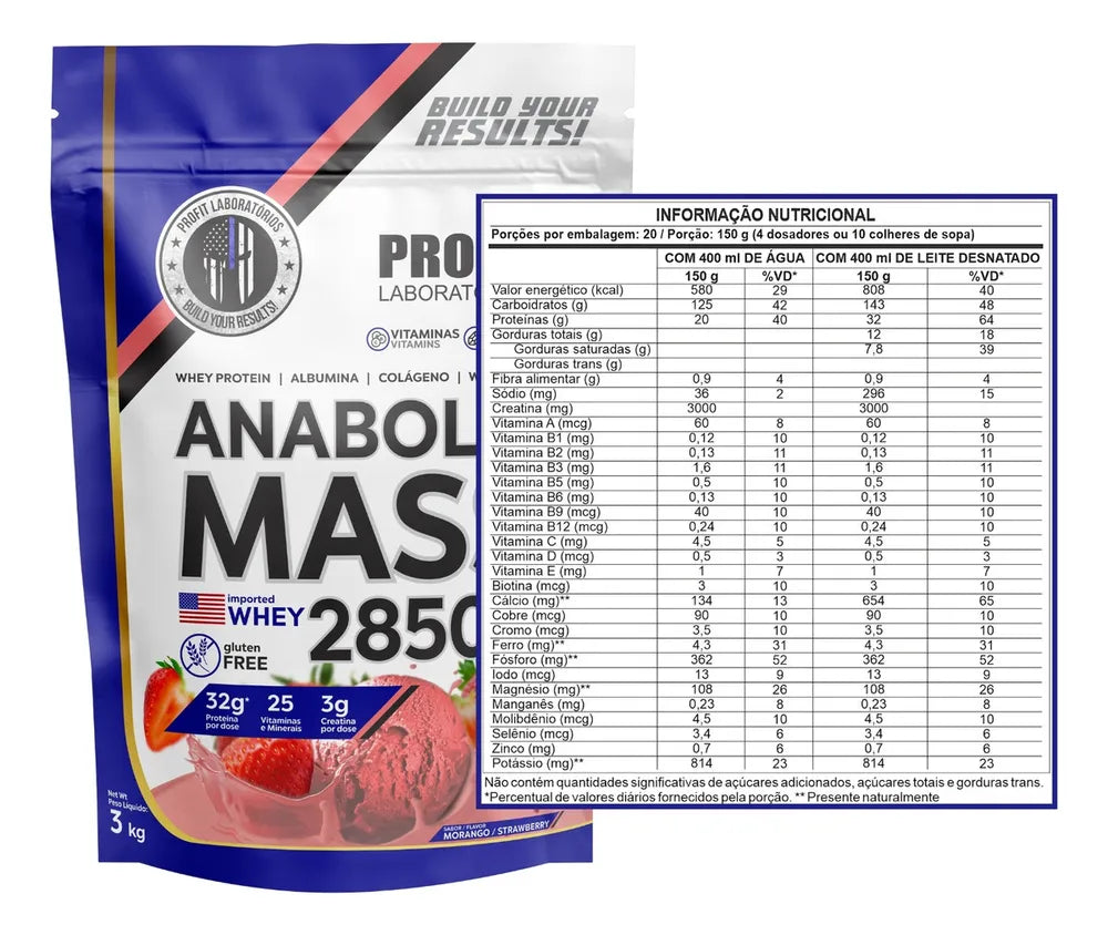 MORANGO: Maltodextrina, concentrado proteico do soro do leite (WPC), waxy maize, soro do leite parcialmente desmineralizado, colágeno hidrolisado, albumina, sacarose, creatina monohidratada, vitamina C (ácido ascórbico), vitamina B3 (niacina), vitamina E (acetato de tocoferol), óxido de zinco, vitamina B5 (D-pantotenato de cálcio), sulfato de manganês, vitamina B2 (riboflavina), vitamina B6 (cloridrato de piridoxina), vitamina B1 (tiamina), óxido de cobre, vitamina B9 (ácido fólico), vitamina A, iodeto de potássio, molibdato de sódio, picolinato de cromo, selenito de sódio, biotina, vitamina B12 (cianocobalamina), vitamina D (colecalciferol), aromatizantes, carboximetilcelulose (espessante), edulcorante sucralose e corante artificial vermelho amaranto.
