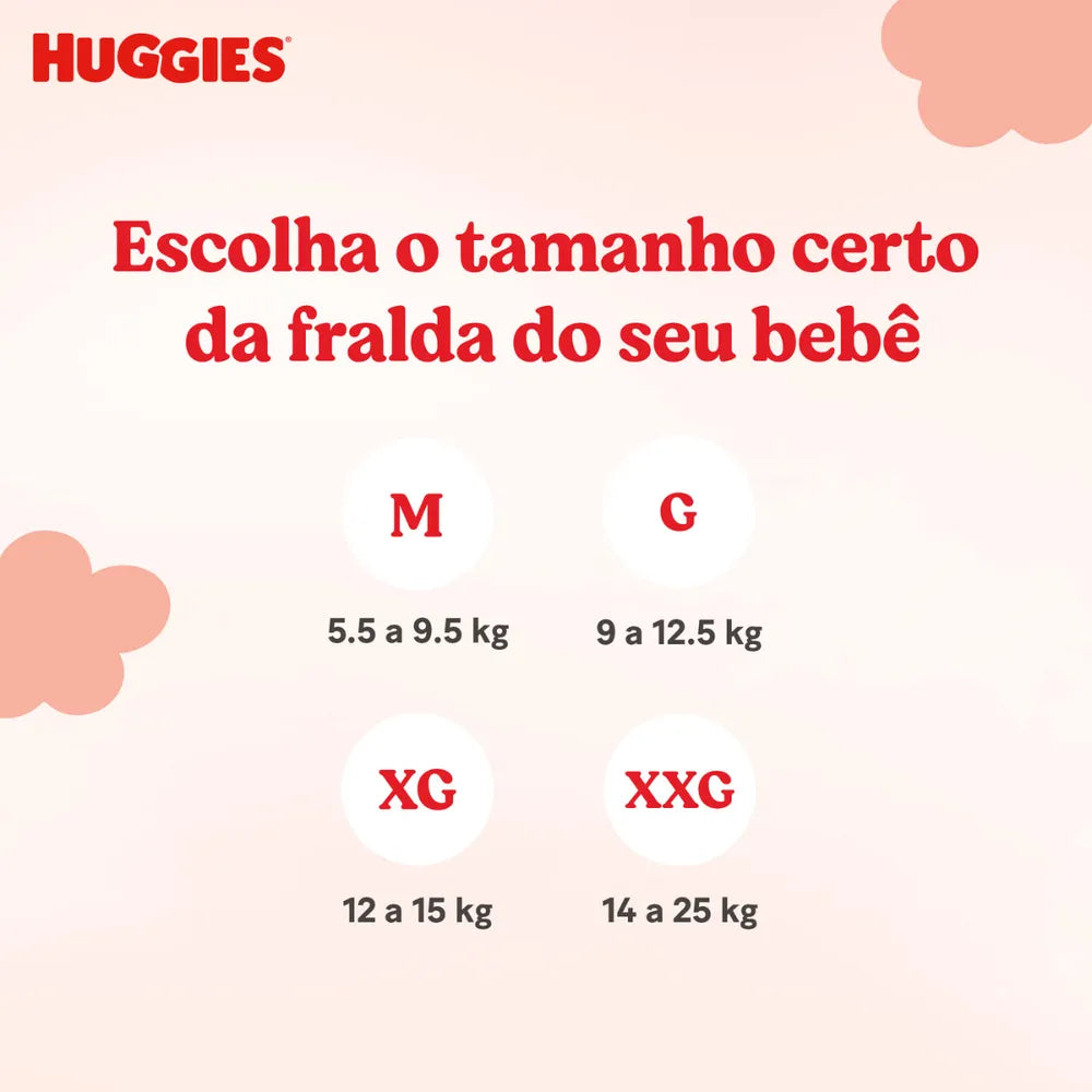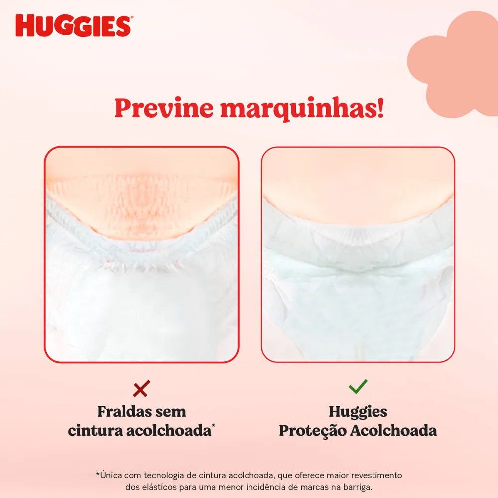 Seu formato tipo roupinha é fácil de vestir e acompanha cada movimento do bebê. Com cintura super macia e melhor proteção de Huggies é escolha ideal para quem busca conforto, praticidade e segurança em todos os momentos do dia. *Desempenho pode variar conforme hábitos, alimentação e características do bebê.