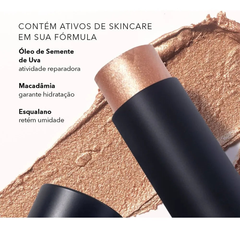 Enriquecido com óleo de semente de uva, macadâmia e esqualano, o Highlight Stick cuida da sua pele enquanto ilumina. A cor Bronze é versátil e se adapta a diversos tons de pele, garantindo alta pigmentação com apenas uma pequena quantidade de produto.