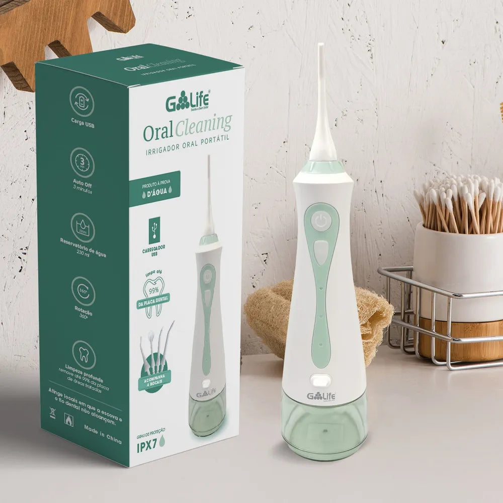 O Irrigador Oral Portátil G-life Cor Branco E Verde 110v/220v é o caminho certo para melhorar a saúde da sua gengiva e ter um sorriso mais saudável! Este dispositivo proporciona uma limpeza bucal superior e um frescor incomparável. Ele ajuda a remover resíduos de comida entre os dentes, prevenindo contra bactérias orais e massageando a gengiva. O produto possui bocais de reposição, 3 modos de ajuste do jato de água, desligamento automático após 3 minutos de uso contínuo, reservatório de 230 ml, rotação 360° e carregamento via USB.