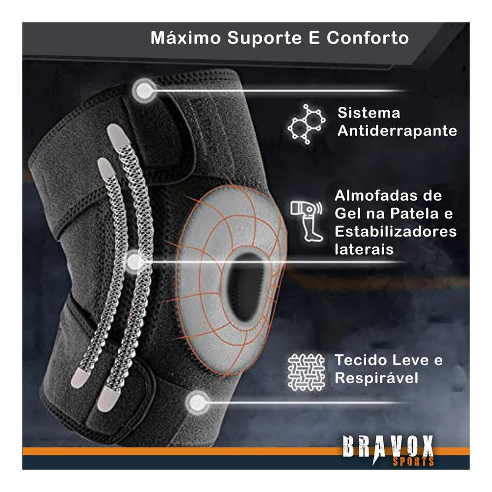 Com tecido resistente em Neoprene e Elastano, ela oferece compressão ajustável, estabilidade durante os movimentos e absorção de impactos, reduzindo o risco de lesões graves ou acelerando a recuperação em caso de contusões.