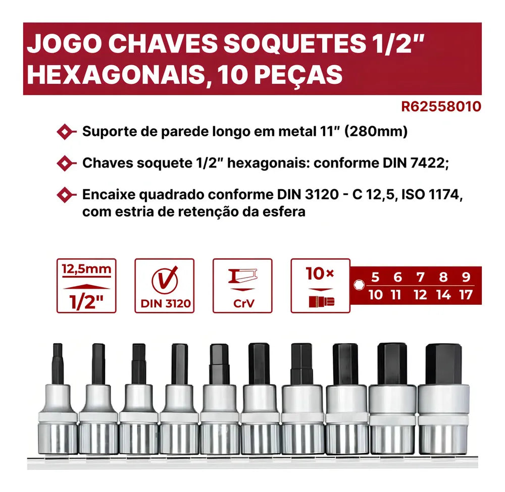 Apresentamos o Jogo De Chaves Soquete 10 Pçs 1/2 Hexag Gedore Red R62558010, uma ferramenta indispensável para qualquer profissional ou entusiasta do bricolage. Este conjunto é feito de Aço Cromo-vanádio, garantindo durabilidade e resistência ao desgaste. As chaves hexagonais são ideais para apertar e soltar parafusos e porcas com cabeças hexagonais, tornando-as uma ferramenta versátil para uma variedade de tarefas. A marca Gedore Red é conhecida pela sua qualidade superior e design ergonómico, proporcionando conforto e eficiência no uso. Este conjunto é uma adição valiosa para qualquer caixa de ferramentas.