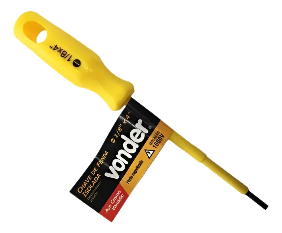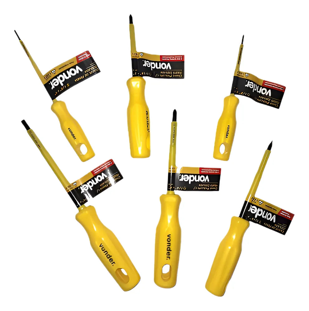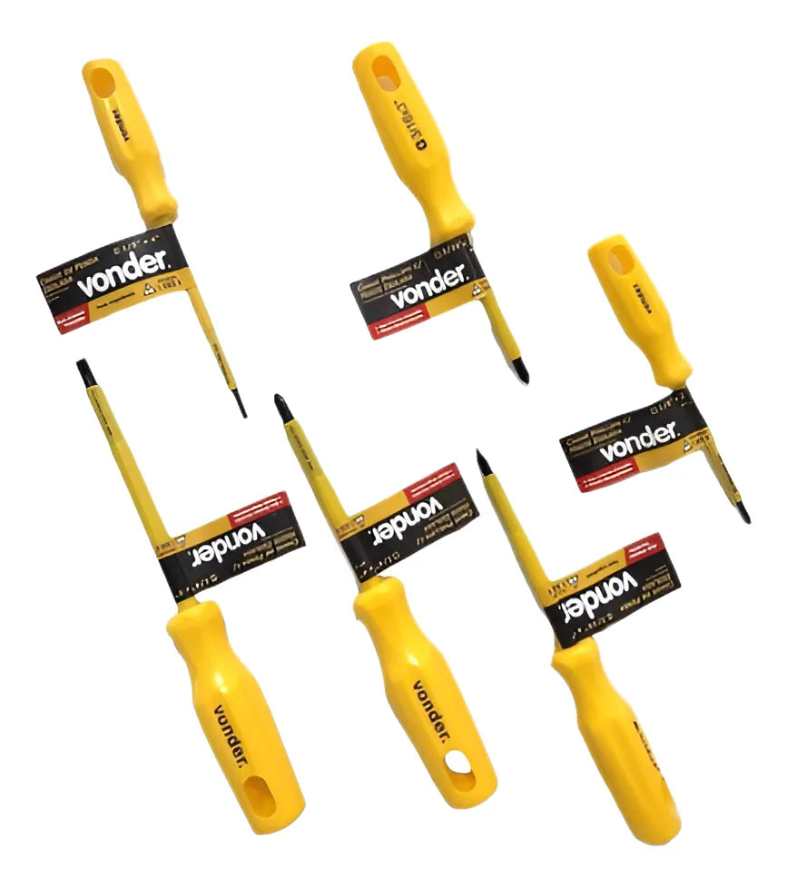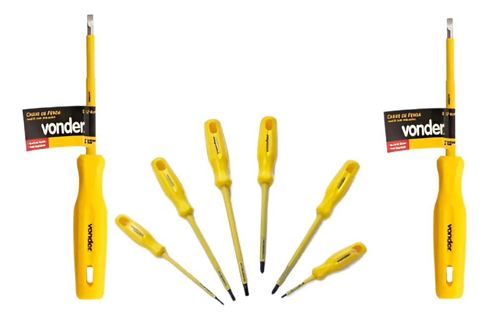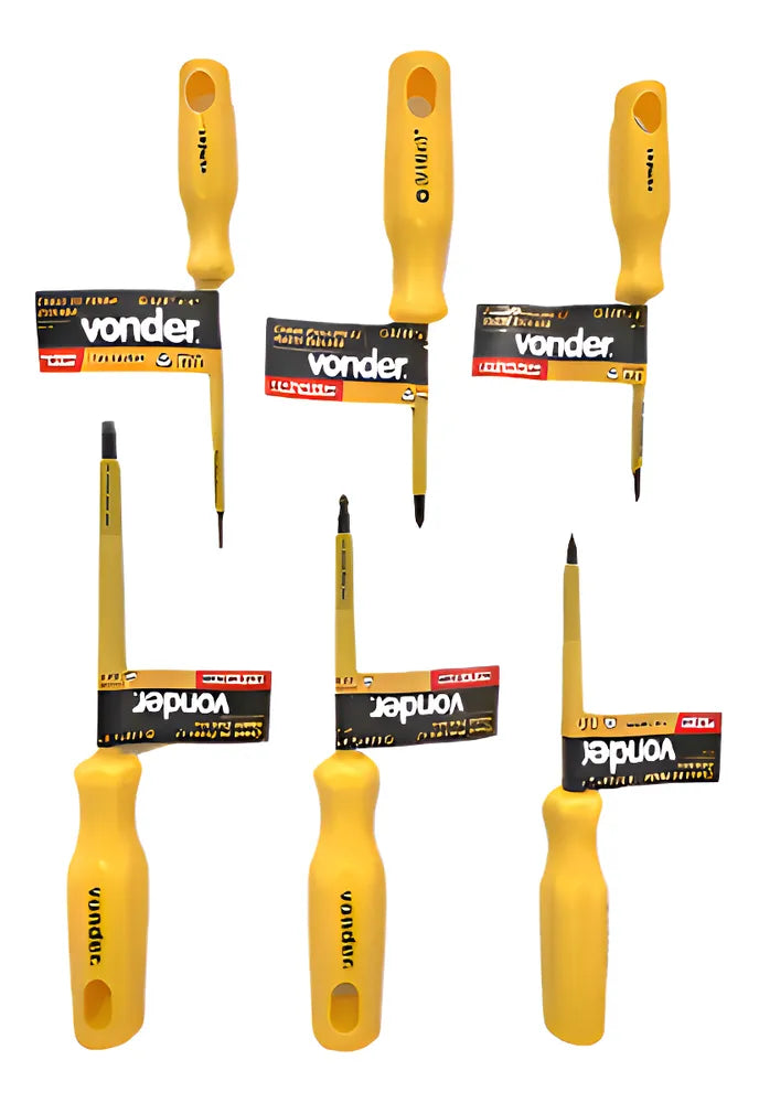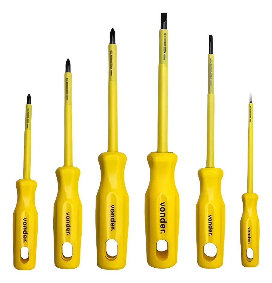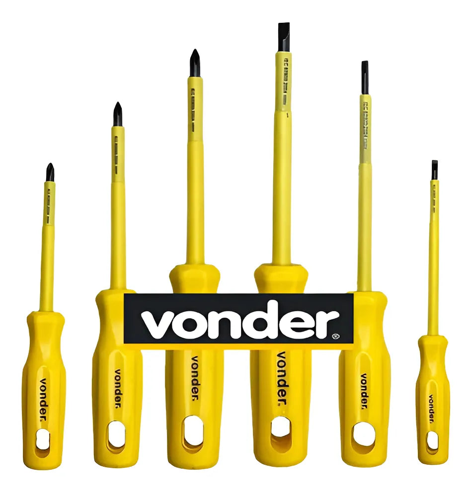 -01 Conjunto de 06 Chaves de Fenda e Phillips uso Profissional com Haste Isolada 1000V de Marca Vonder. Cabo e haste isolados 1000V de acordo com a norma NBR 9699 e recomendação da NR-10. Vem com Cabo ergonômico que proporciona menos esforço e muito mais torque e com design exclusivo. Todas as chaves são produzidas em Aço Cromo Vanádio com Haste temperada em toda a sua extensão. Possuem a Ponta Oxidada e Imantada, facilitando o trabalho do dia a dia.