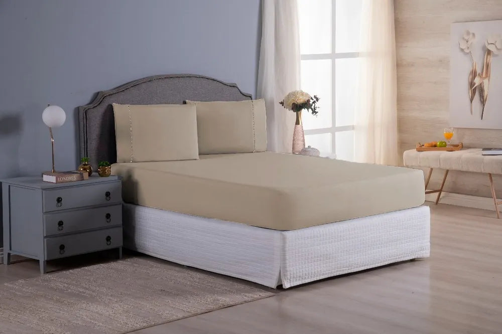 Cáqui - Jogo de lençol com elástico percal 200 fios Queen 3 peças com ponto palito na fronha.