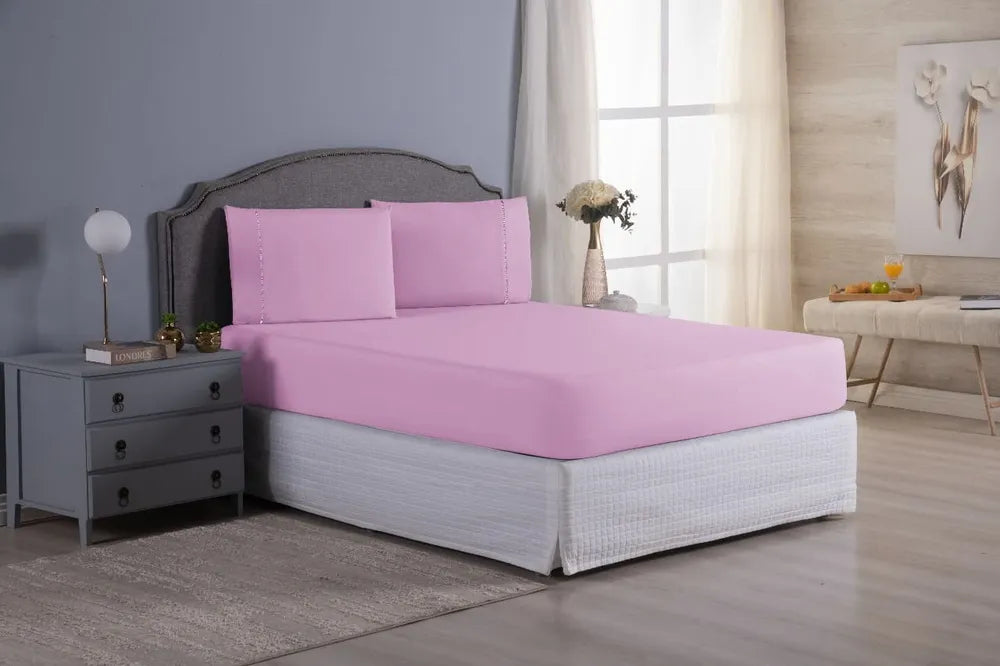 Rosa - Jogo de lençol com elástico percal 200 fios Queen 3 peças com ponto palito na fronha.