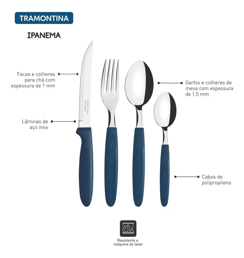 Quer uma solução prática para ter o talher certo para as mais diferentes refeições? Então conheça o Faqueiro Tramontina Ipanema com Lâminas em Aço Inox e Cabos de Polipropileno Preto com Pote Plástico 24 Peças. Um faqueiro com garfos, facas e colheres para servir da entrada à sobremesa, que tem peças produzidas com lâminas em aço inox com espessura e formatos diferenciados que garantem maior durabilidade e resistência. Os cabos são produzidos em polipropileno e garantem maior conforto no manuseio, além de deixar sua mesa muito mais moderna, devido a cor preta. Ele ainda acompanha um pote plástico, perfeito para armazenar suas peças ou alimentos como macarrão ou outros grãos. Com certeza, a escolha ideal para sua cozinha!
